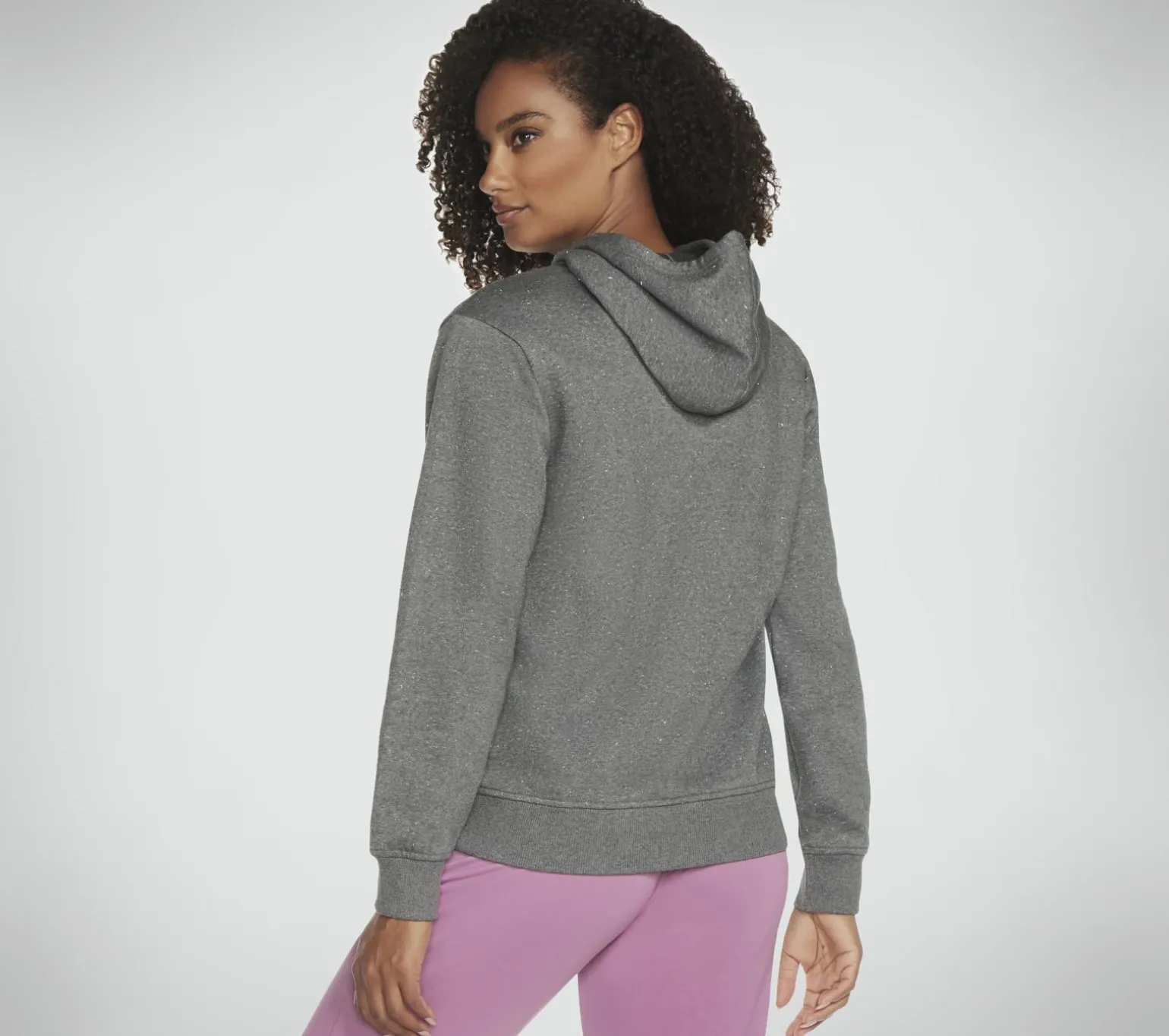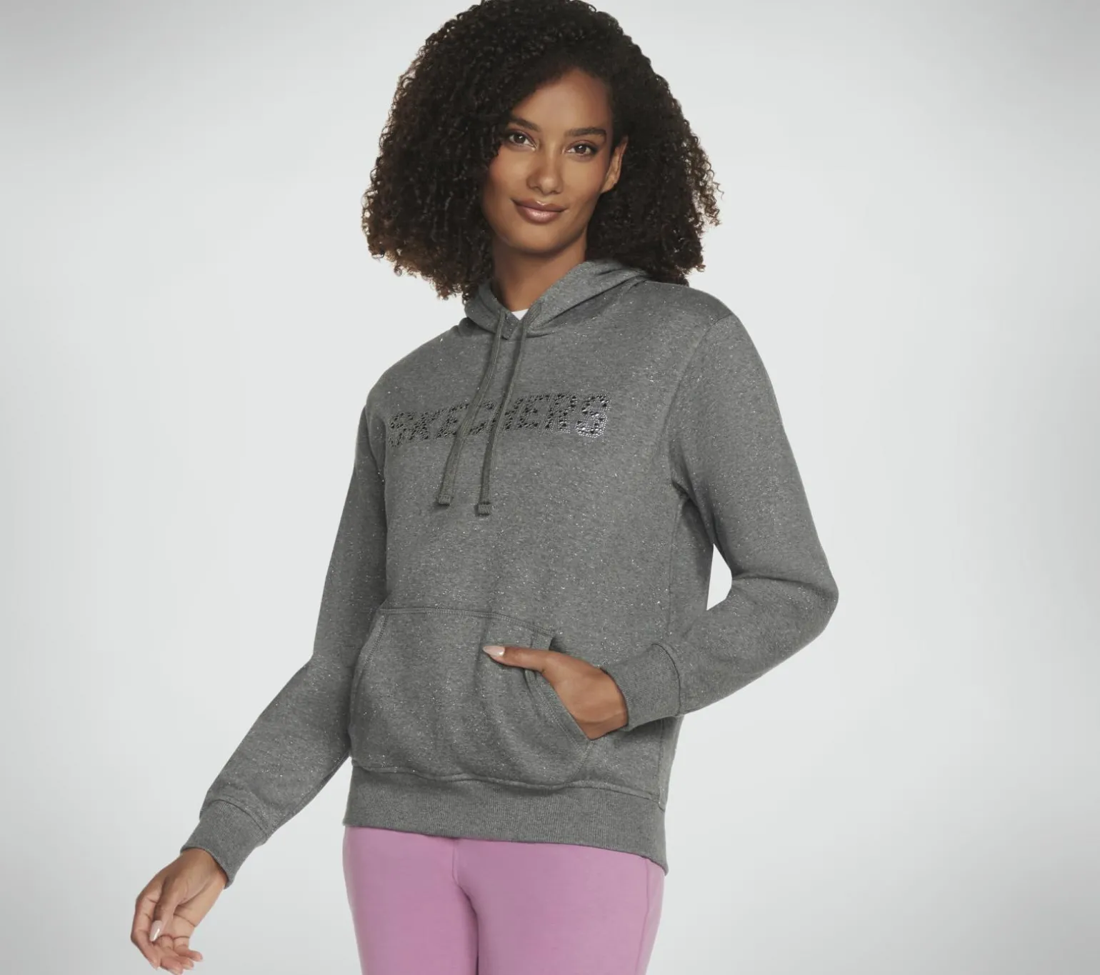 Add a touch of sparkle to your sporty leisure look wearing Skechers SKECH-SWEATS Shine Hoodie. This breathable pullover hoodie is made with heavyweight SKECH-SWEATS lurex fleece and features 2-inch ribbed cuffs and hem, a kangaroo pocket, and central rhinestone Skechers logo at the chest.