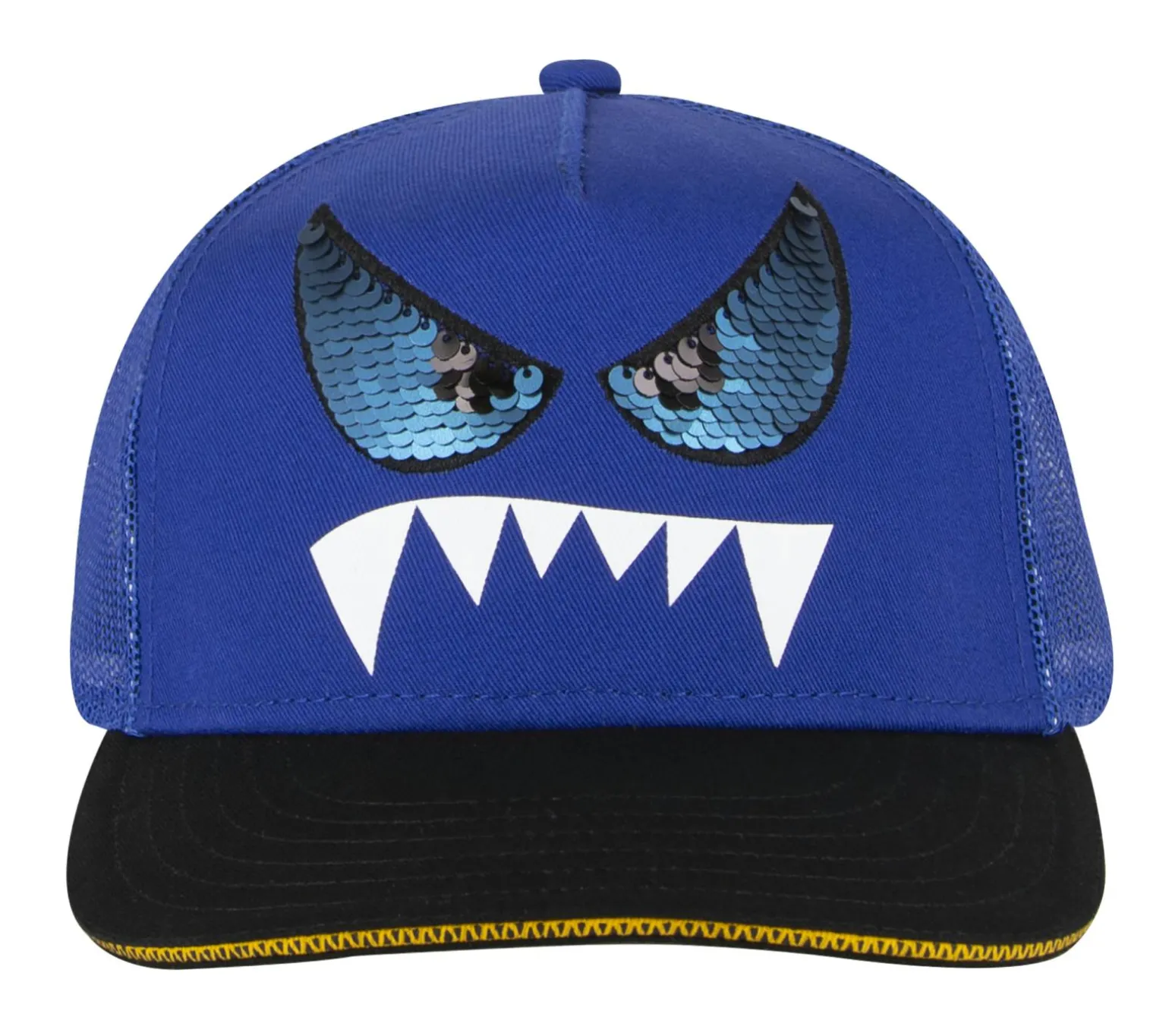 Scary good style comes with comfort in Skechers Monster Eyes Trucker Hat. Featuring a woven fabric and mesh fabric in an adjustable trucker cap design with ‘Monster Face’ design with fun flippable sequin eyes effect.