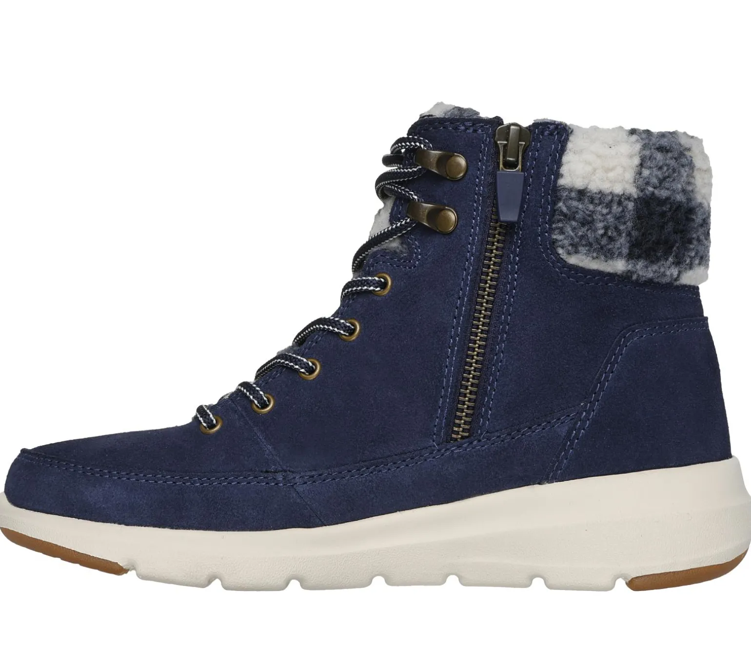 Stay warm throughout the season with Skechers On-the-GO Glacial Ultra – Timber. This casual cold-weather zip boot features a lace-up suede upper with a buffalo plaid print sherpa lining, Skechers Air-Cooled Goga Mat insole and a lightweight ULTRA GO® midsole.