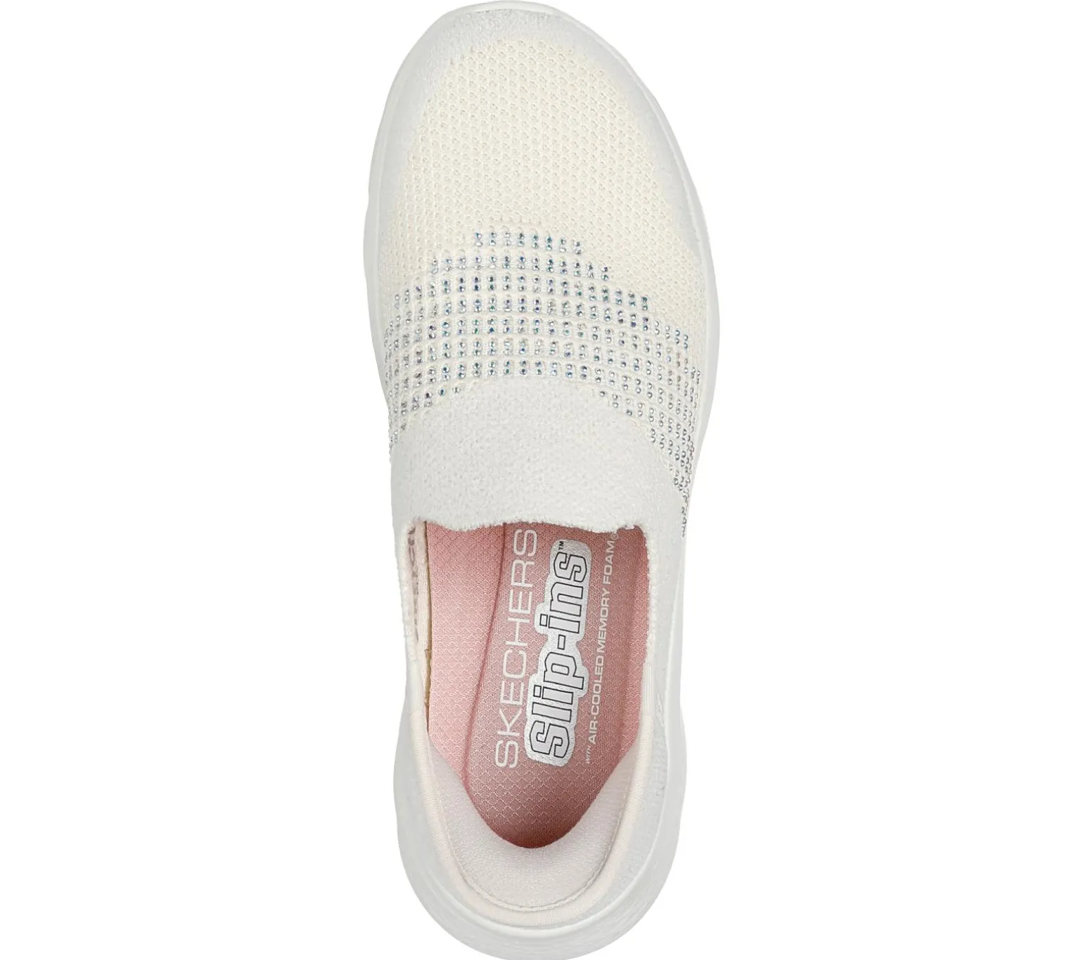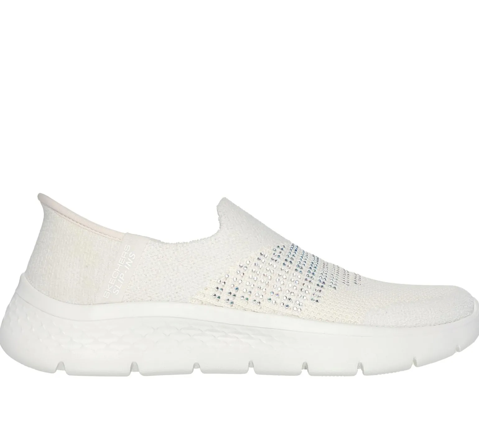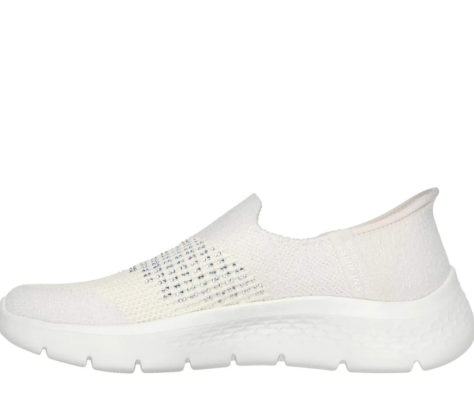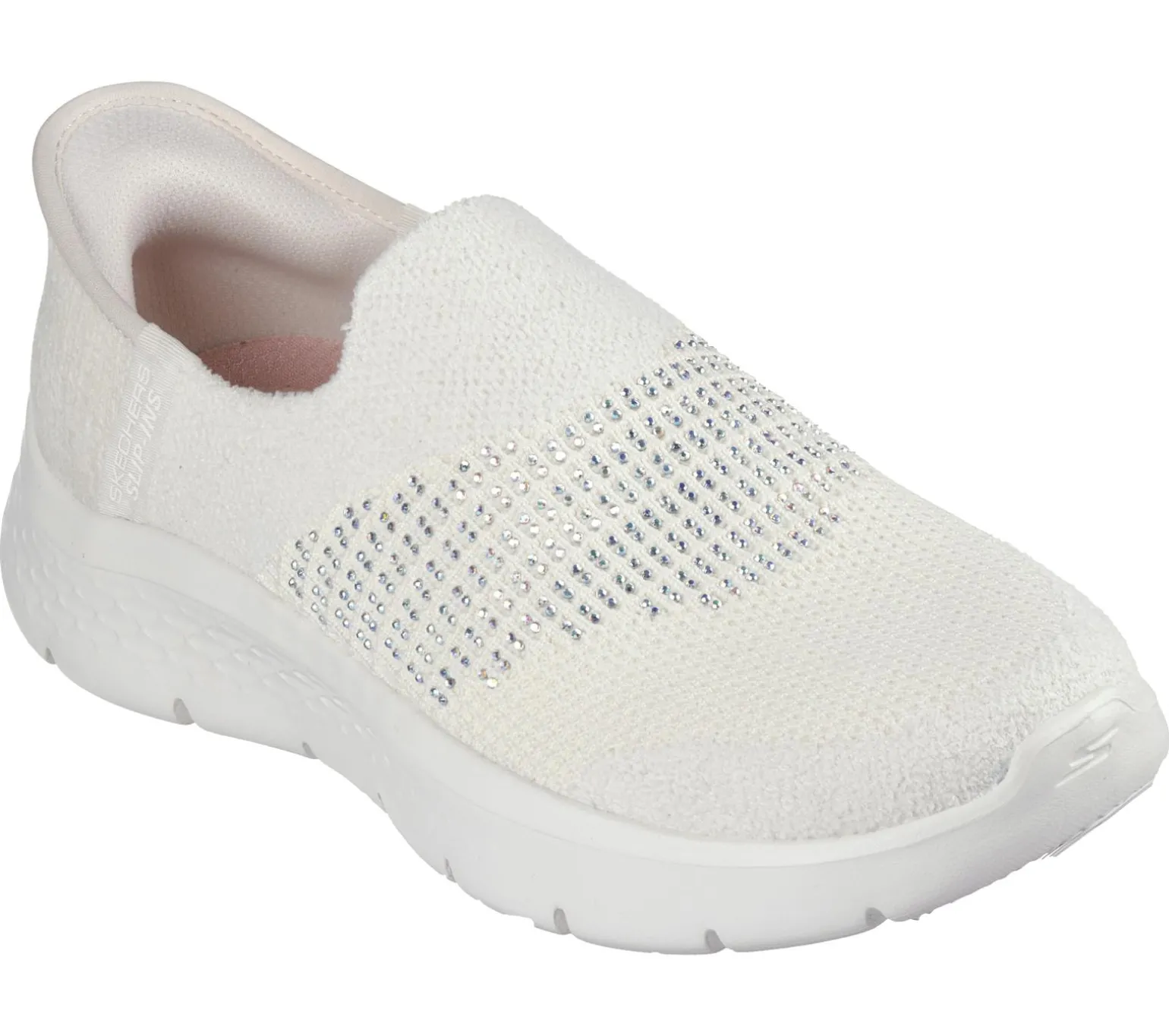 Step into luxurious style and effortless comfort wearing Skechers Hands Free Slip-ins®: GO WALK® Flex – Addilyn. Designed with our exclusive Heel Pillow, this laceless vegan slip-on features a textured, velvety-soft knit upper with a mini rhinestone-embellished instep, Skechers Air-Cooled Memory Foam® insole, and lightweight ULTRA GO® cushioning.