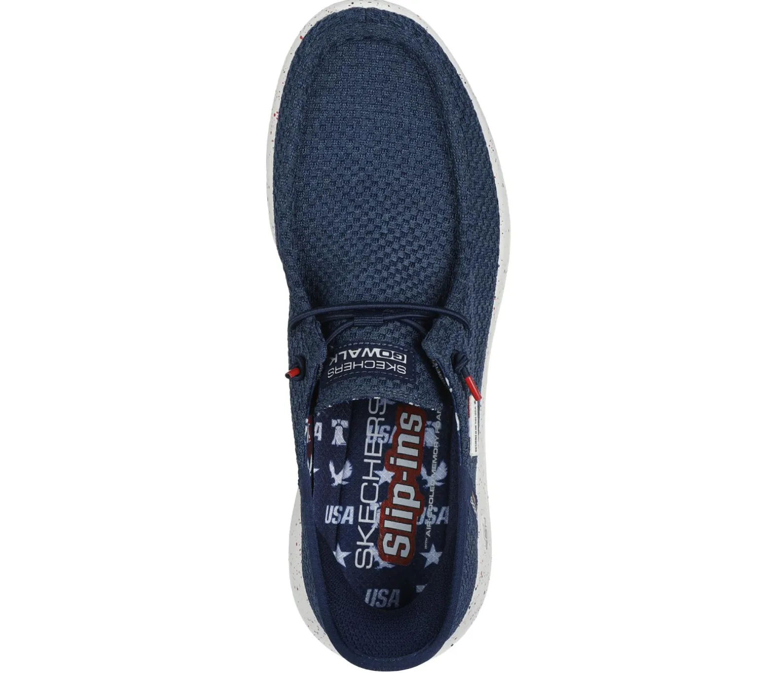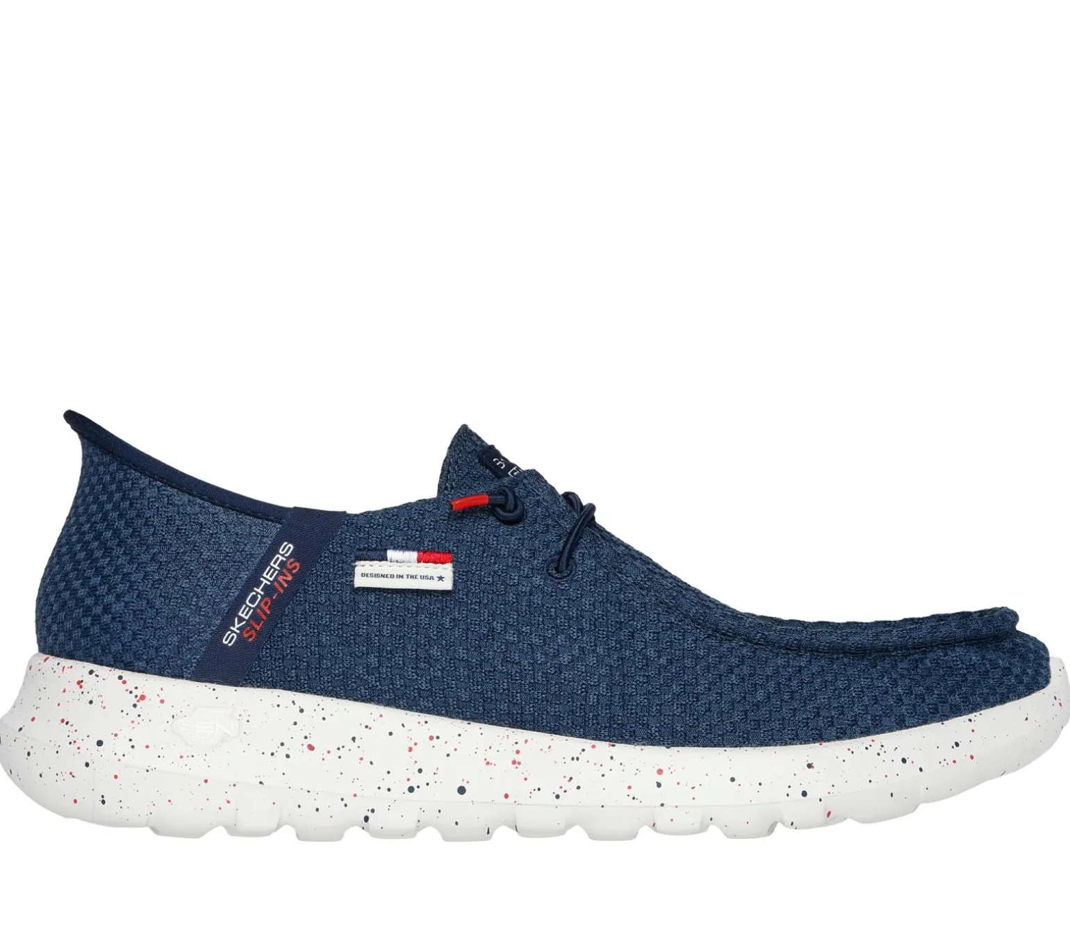 Give cheers to the red, white, and blue in Skechers Hands Free Slip-ins®: GO WALK Max – The American Dream. Designed with our exclusive Heel Pillow, this Americana themed moc toe style features a knitted upper with stretch laces, Skechers Air-Cooled Memory Foam® insole and lightweight 5GEN® cushioning.
