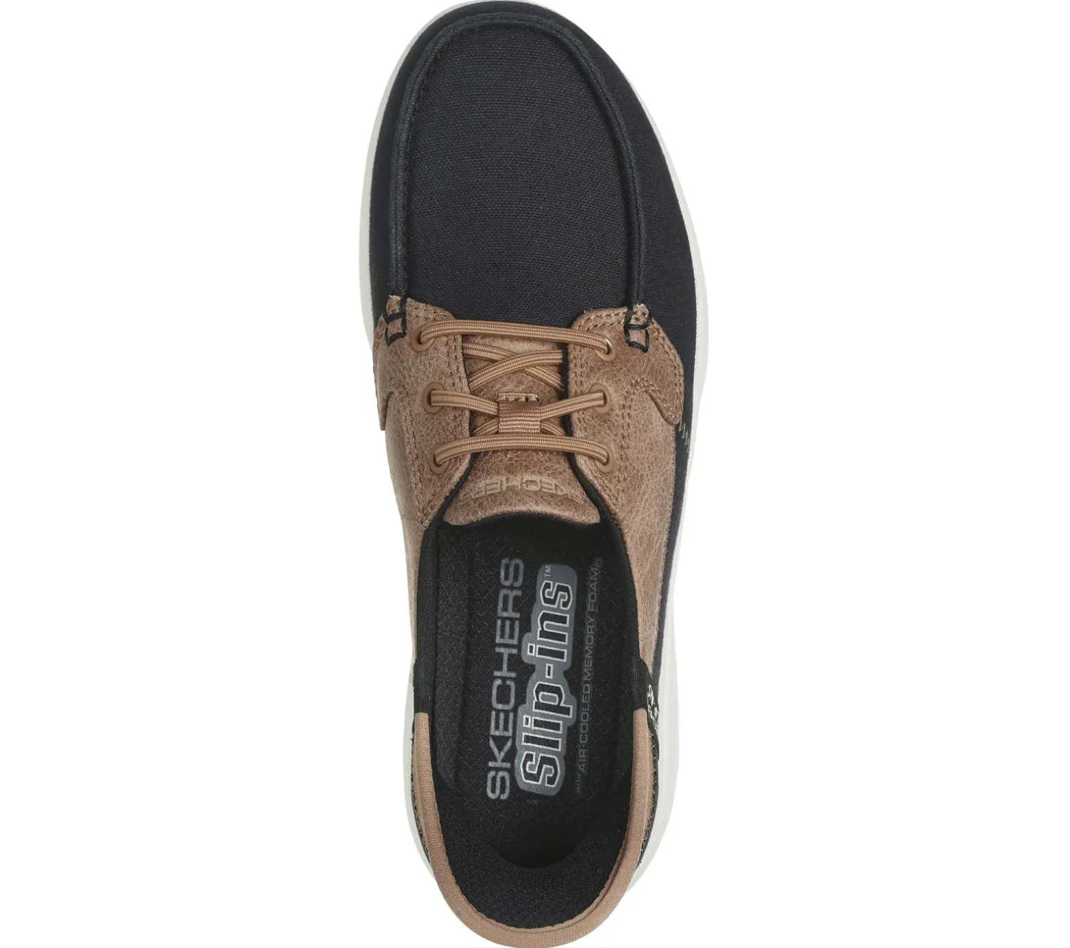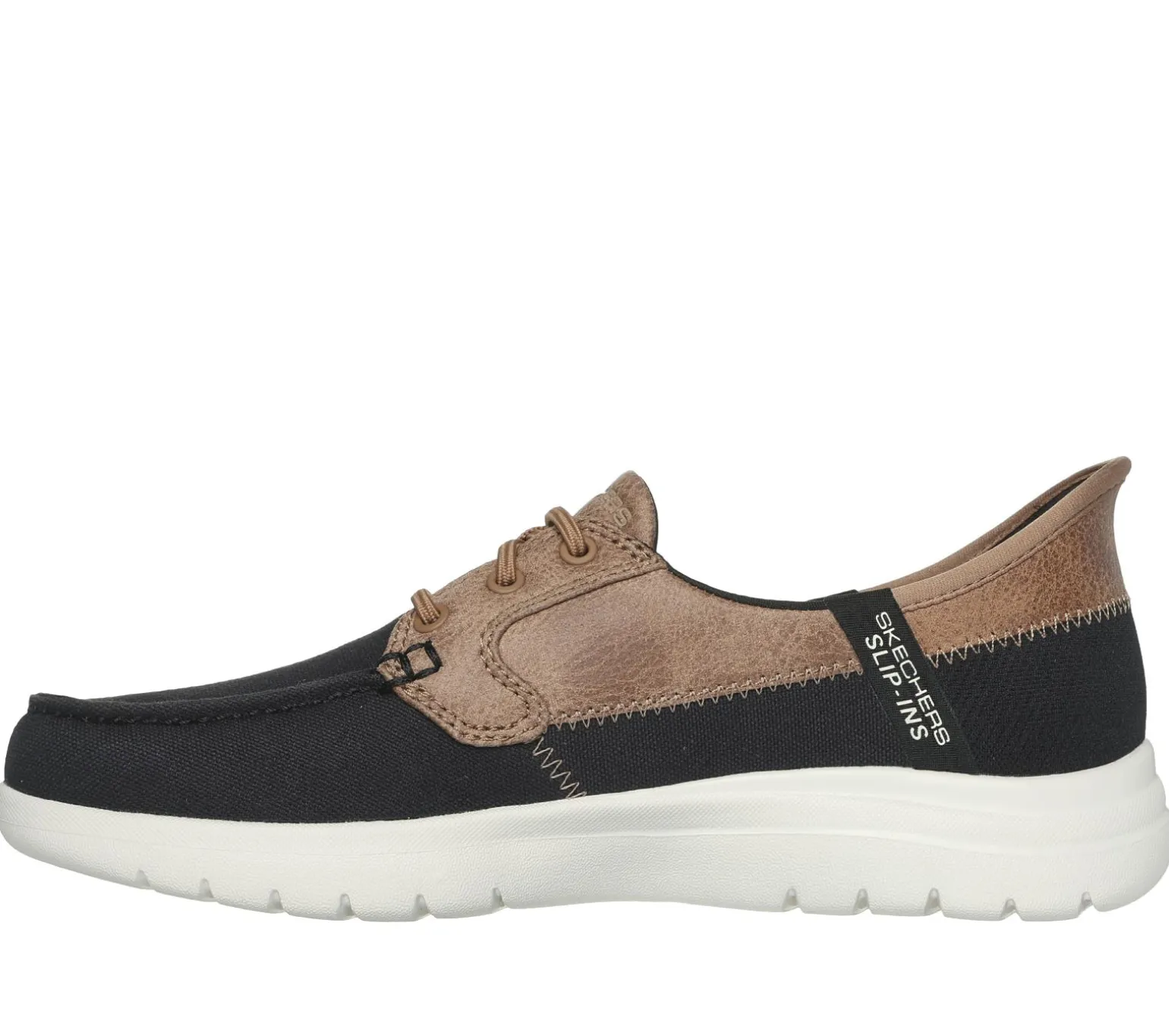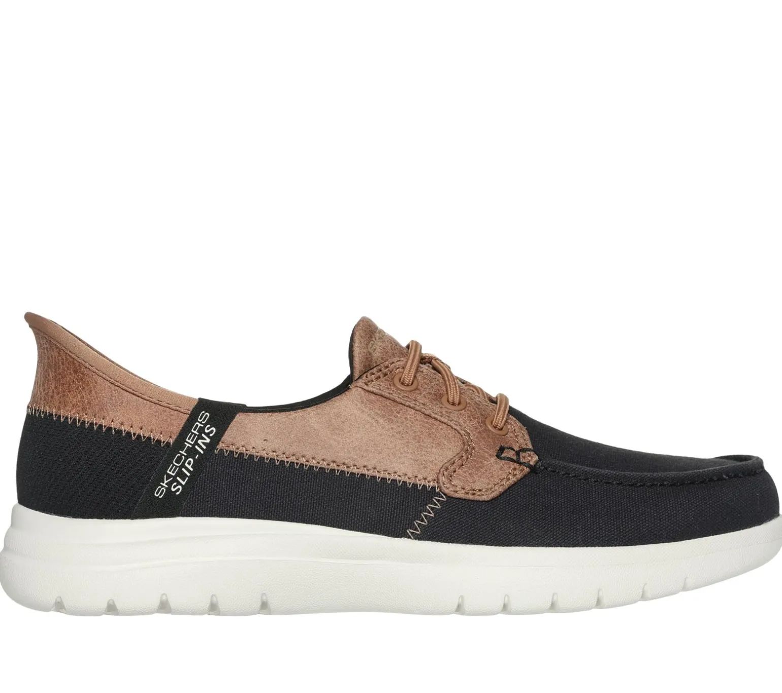 Step-in to convenient nautical comfort and cushioning wearing Skechers Hands Free Slip-ins® On-the-GO® Flex – Palmilla. This casual boat shoe style features a canvas and faux leather upper, our exclusive Heel Pillow, a Skechers Air-Cooled Memory Foam® insole, lightweight ULTRA GO® cushioning, and a hands-free molded heel panel.