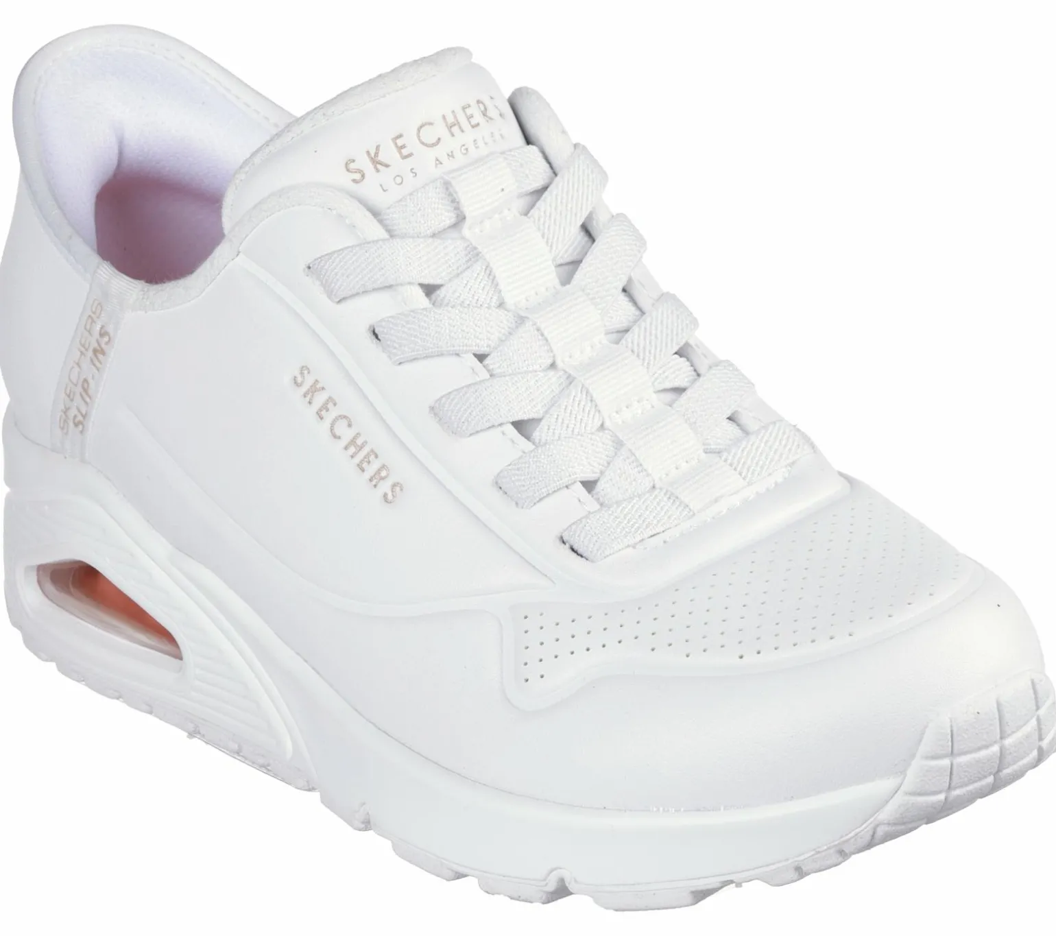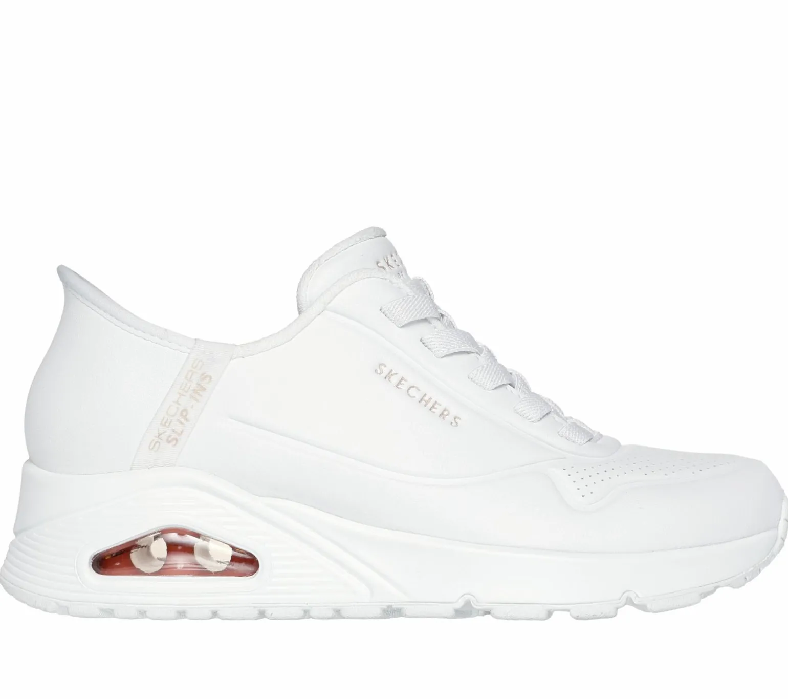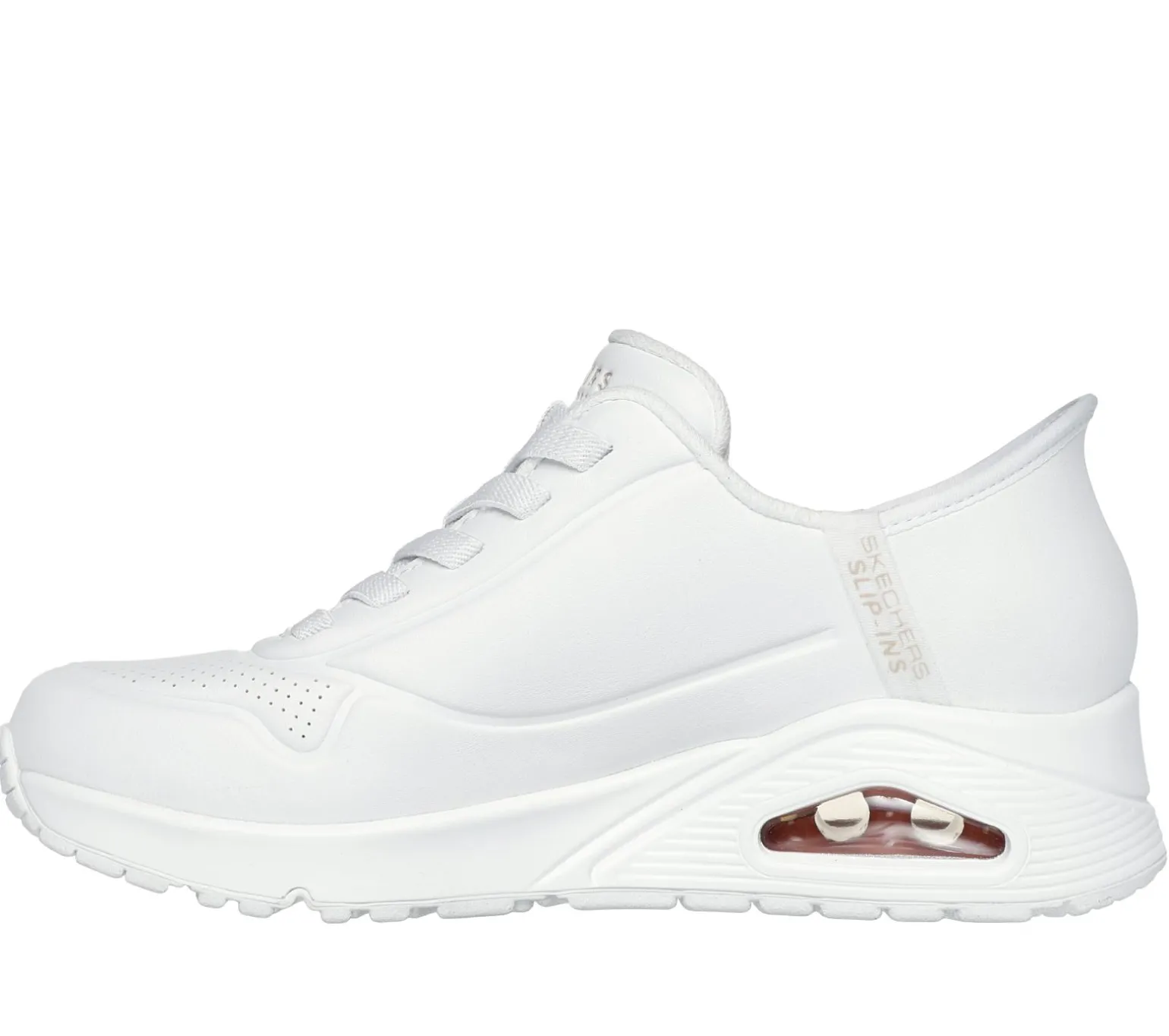 An iconic Skechers favorite is reimagined with effortless comfort in Skechers Street Hands Free Slip-ins®: Uno – Easy-Air. Designed with our exclusive Heel Pillow, this fashion sneaker features a synthetic duraleather upper with stretch laces, a cushioned Skechers Air-Cooled Memory Foam® insole, and a visible Skech-Air® airbag midsole.