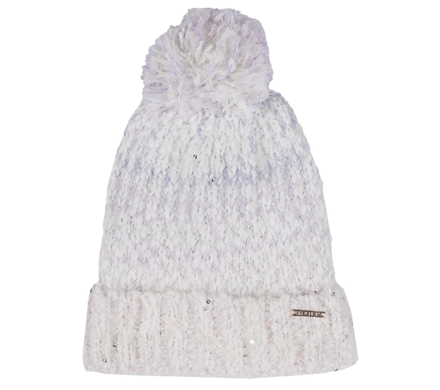 Top off your winter look with cozy comfort wearing Skechers Slub Knit Ivory Pom-Pom Beanie. This plush knit winter hat features faux pearl and pom-pom detail, cuffed hem, and a Skechers rose gold logo label.