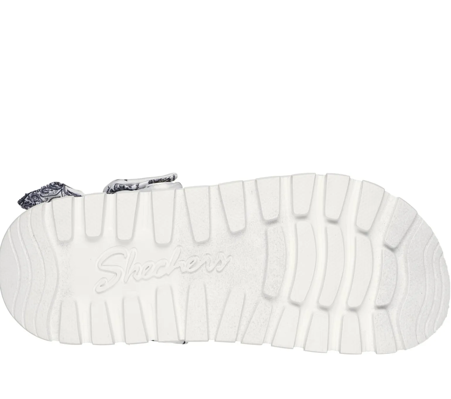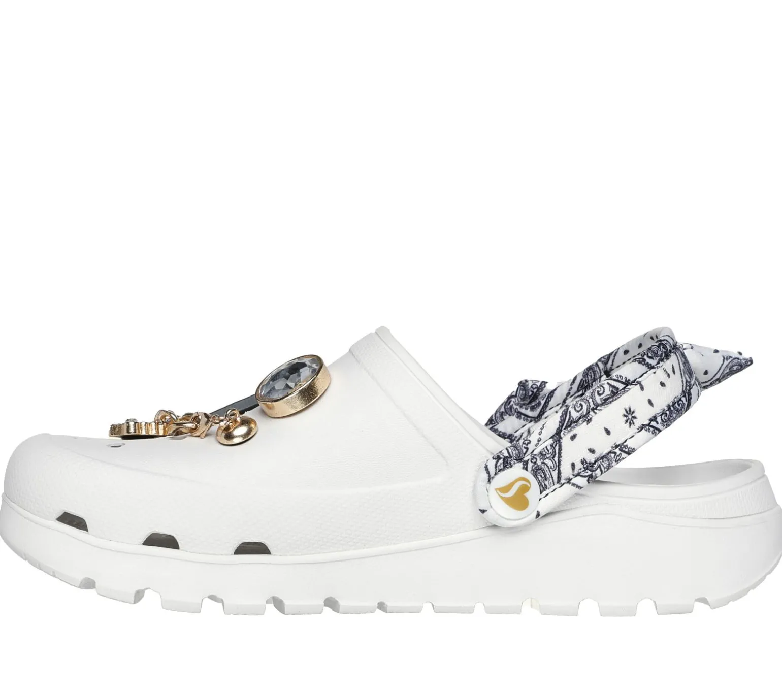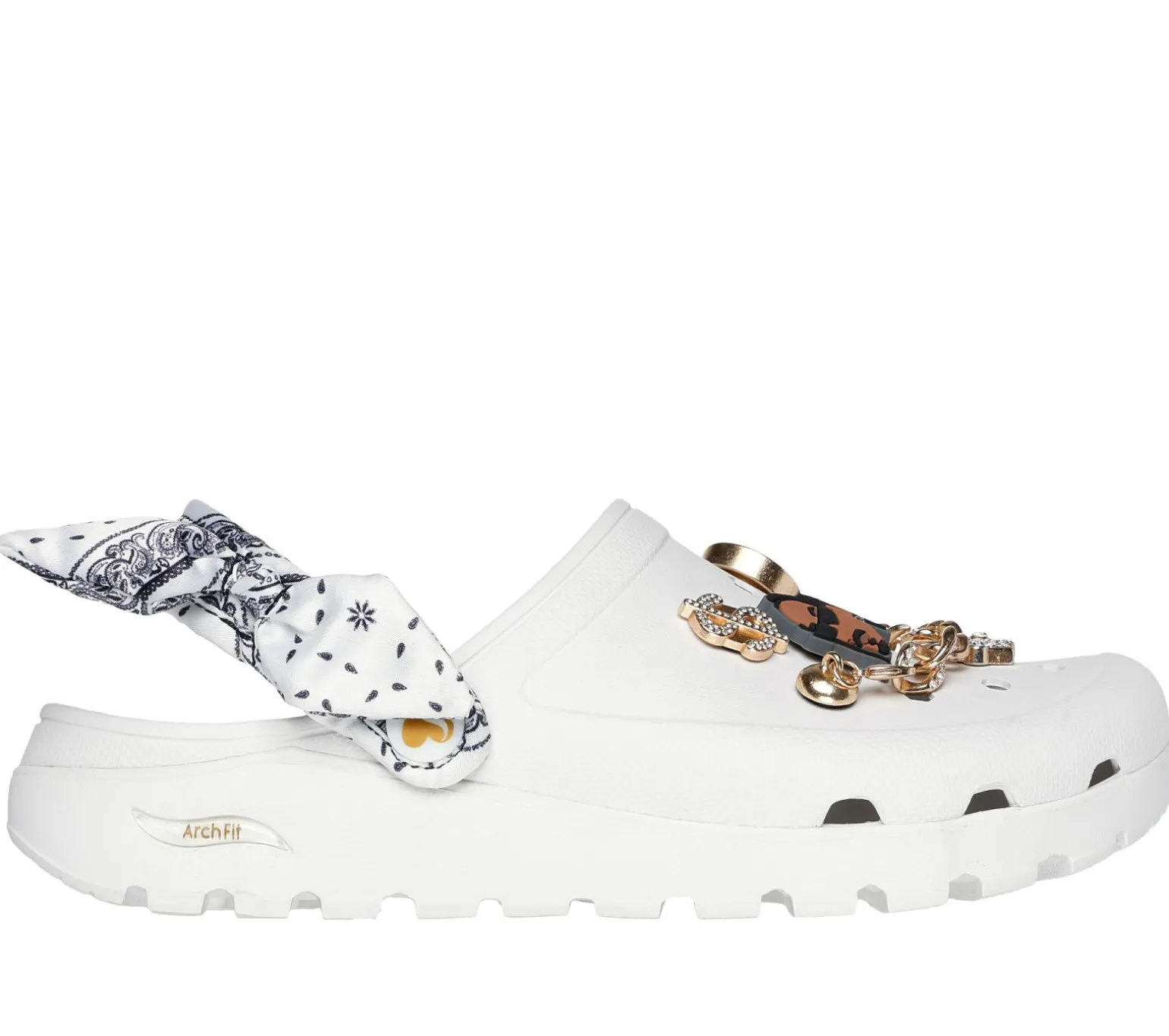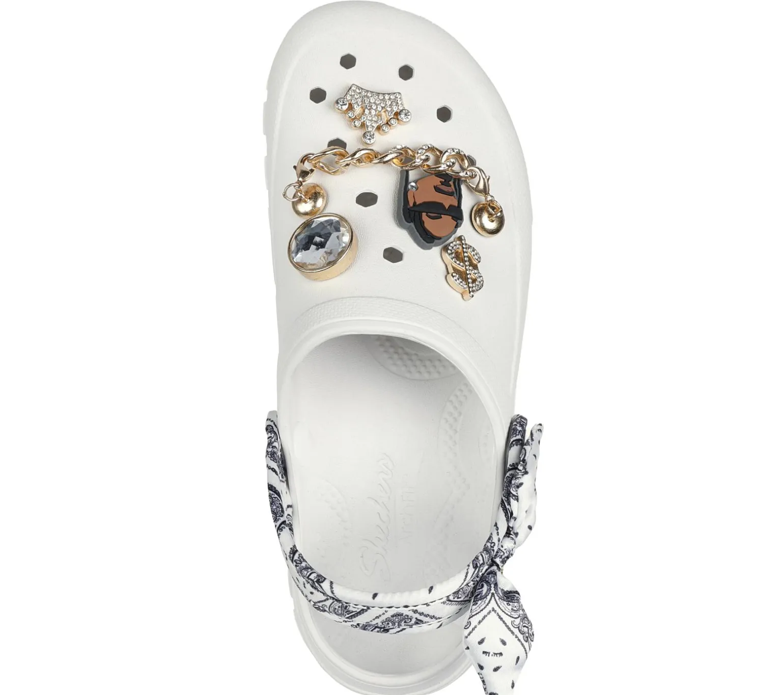 Haute Drop: Rep the D-O-Double-G in G-glam style wearing Skechers x Snoop Dogg: Arch Fit® Footsteps – Rolling Glitz. This head-turning fashion clog features a breathable EVA upper with removable Snoop-themed charms, a satin bandana-wrapped convertible heel strap with bow accent, and a contoured Arch Fit® footbed.