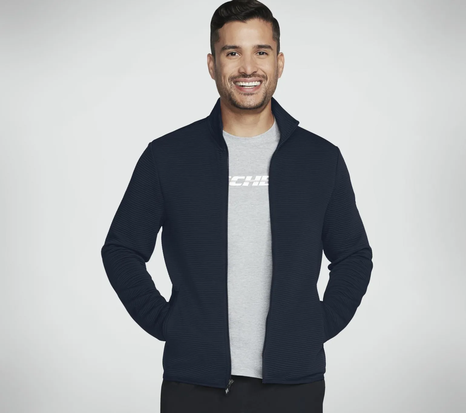 Zip into soft and warm comfort with the Skechers Hoodless Hoodie Ottoman Jacket. This full zip outerwear design features Soft Knit Ottoman jersey fabric engineered from recycled polyester, two open welt hand pockets, plus elastic binding at the collar, cuffs, and hem