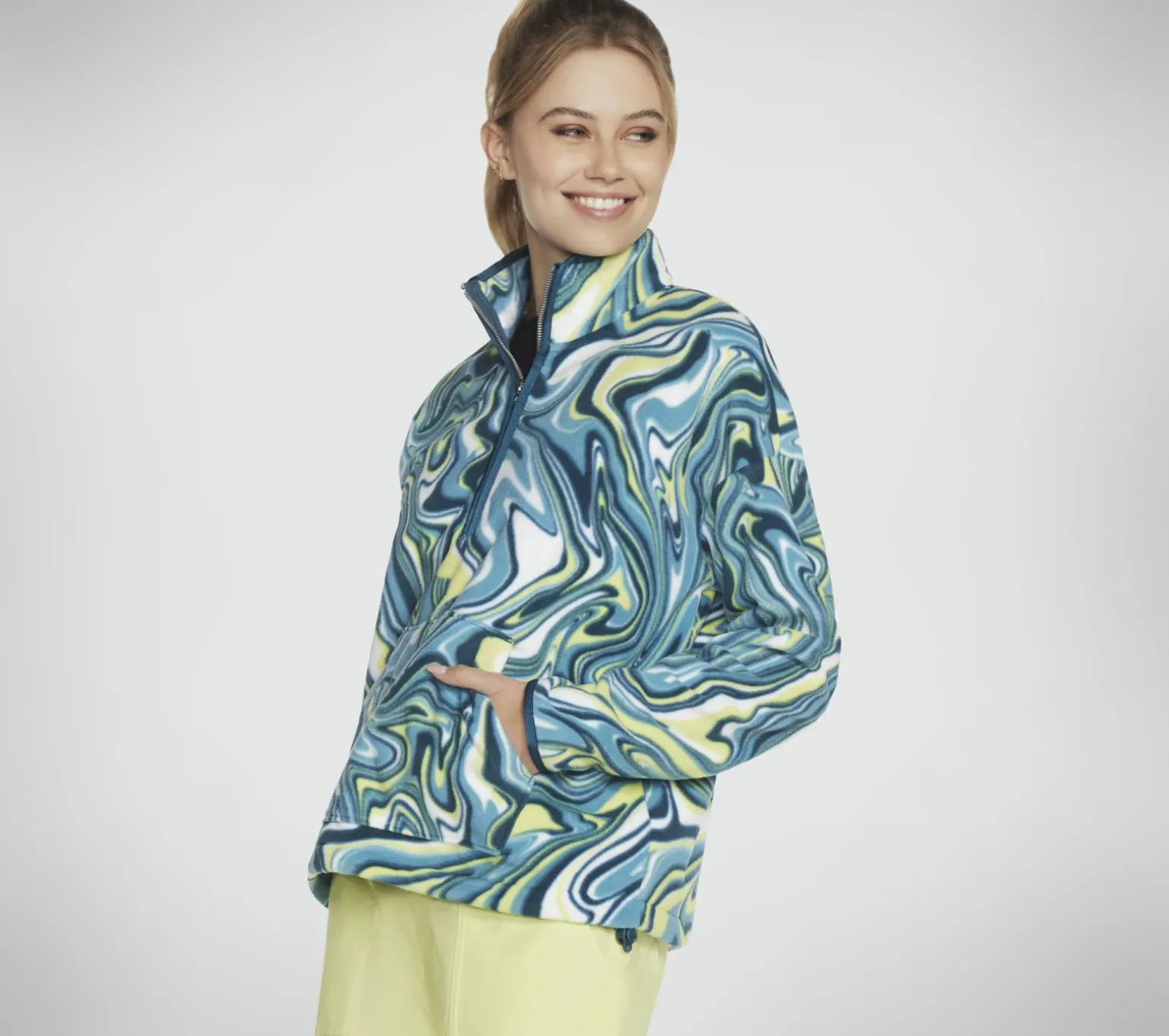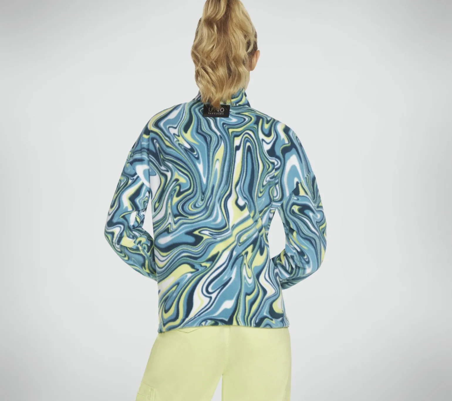 Make an outerwear statement wearing Skechers Street™ Tres-Air 1/4 Zip. Designed in a colorful ‘liquid paint’ print, this bold long sleeve jacket features a mock neck, kangaroo pocket, satin trim, and elasticized hem with adjustable cord stops.