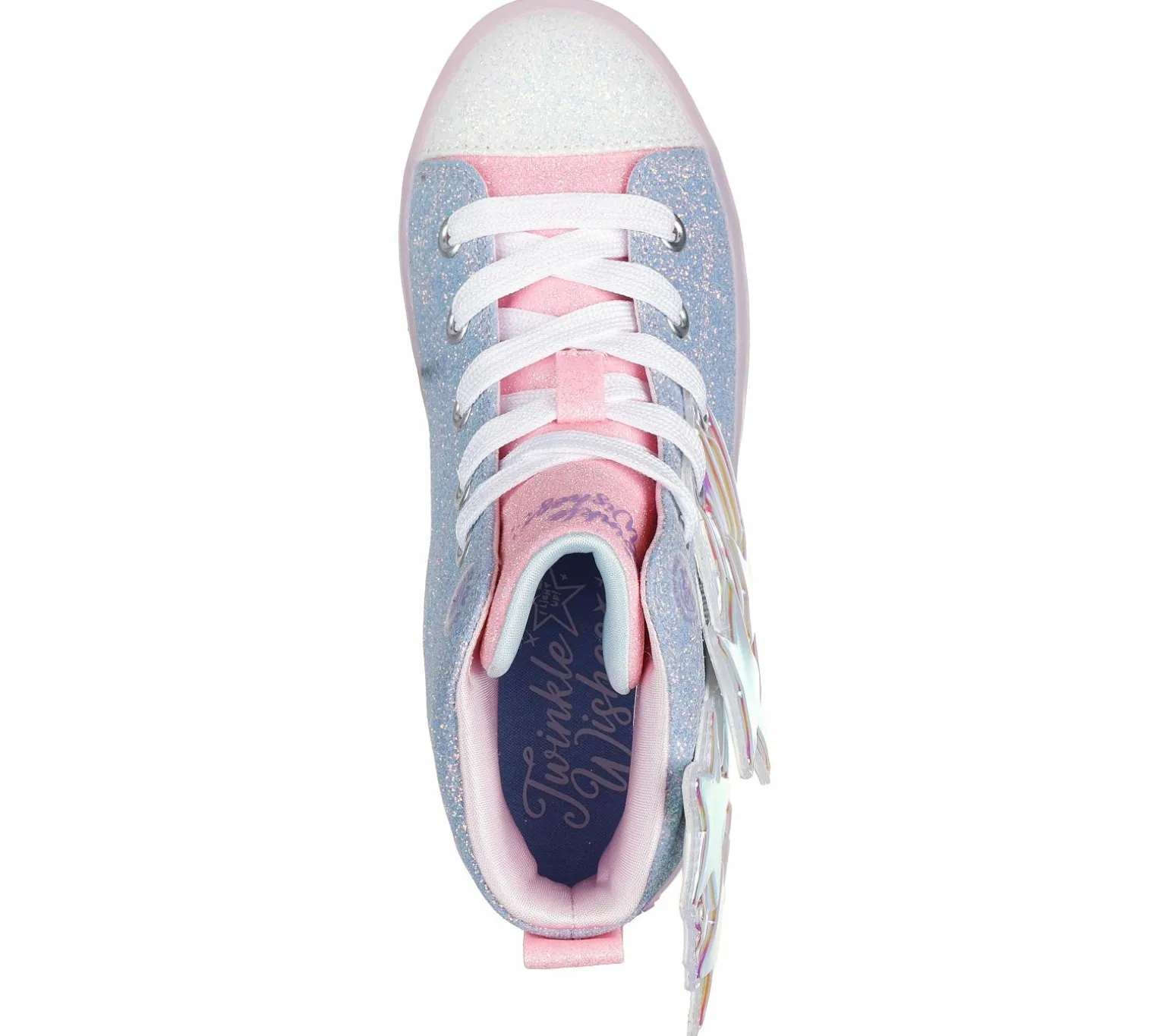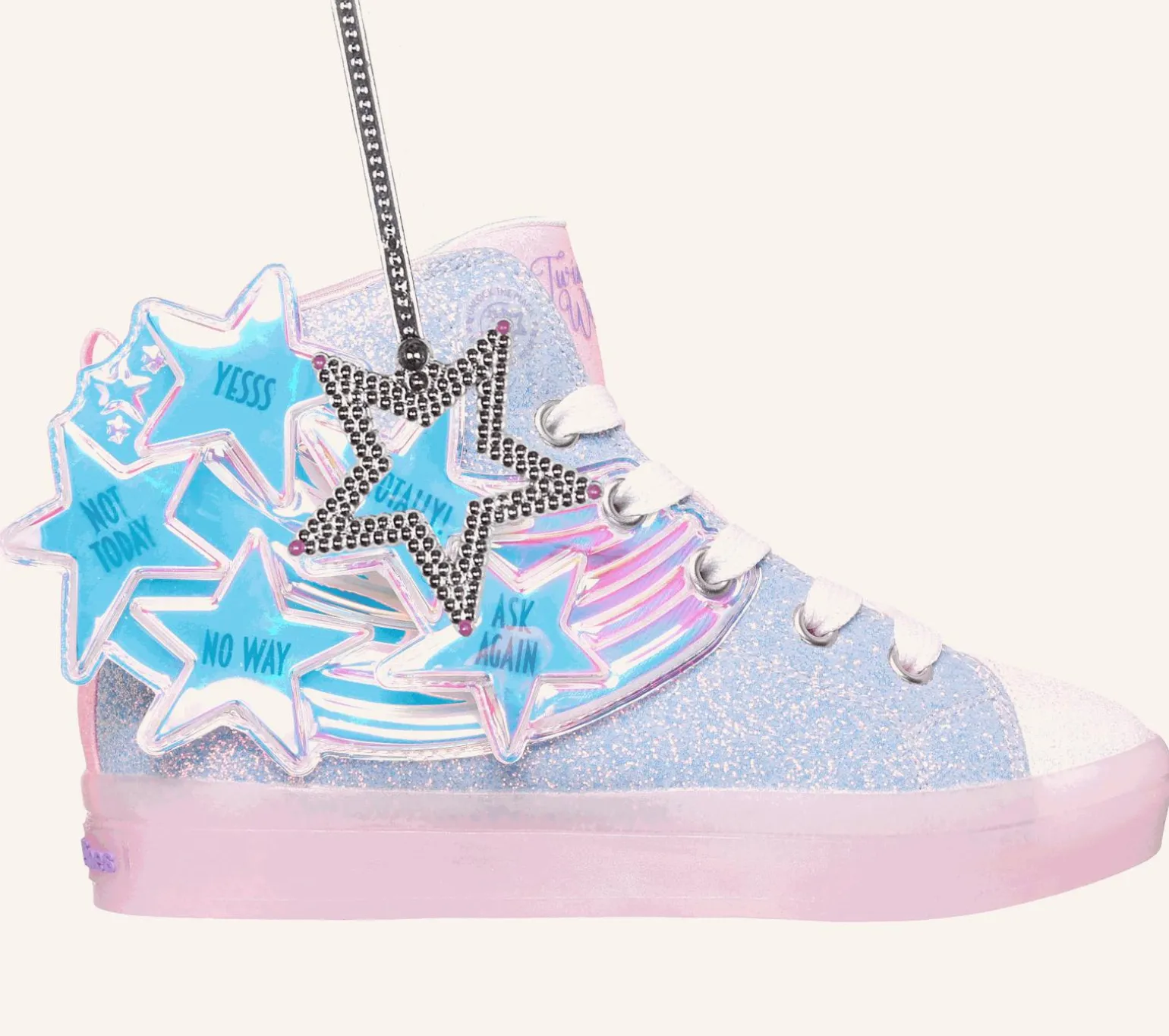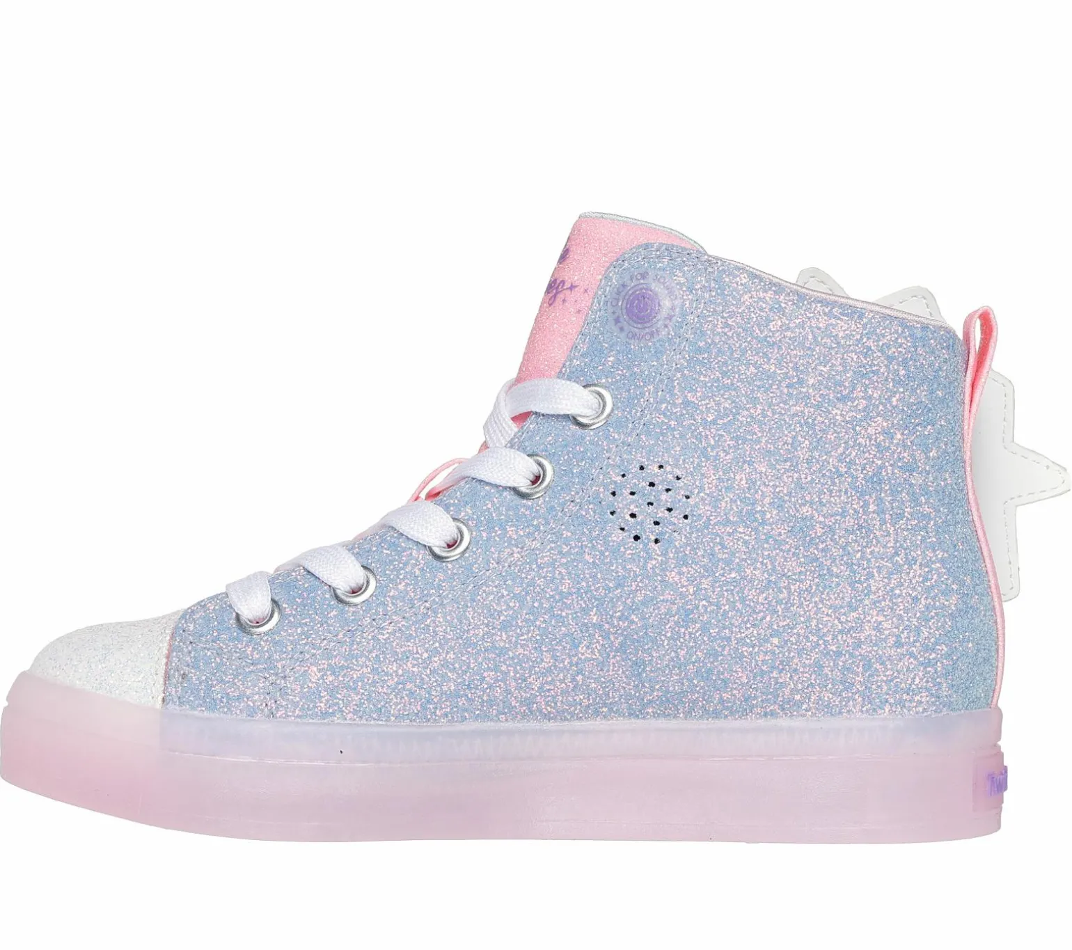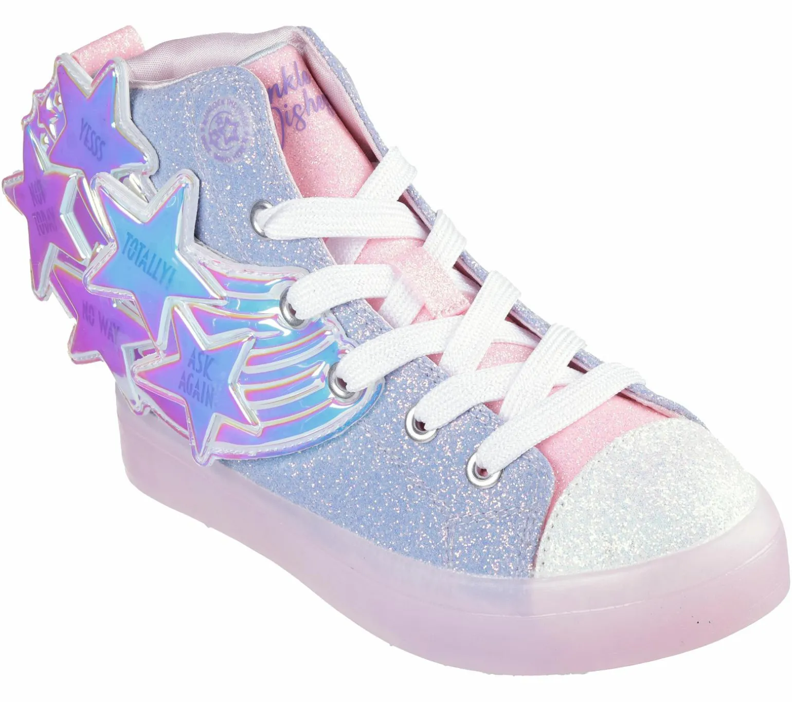 The answers are in the stars with Skechers Twinkle Toes®: Twi-Lites 2.0 – Magical Wish. This fortune-telling high-top lace-up features a synthetic glitter finish upper with light-up fortune-telling stars and a translucent light-up midsole. Included as a gift with purchase is a magnetic fortune-telling wand. Think of a wish and wave your wand over the star icon to reveal your answer!