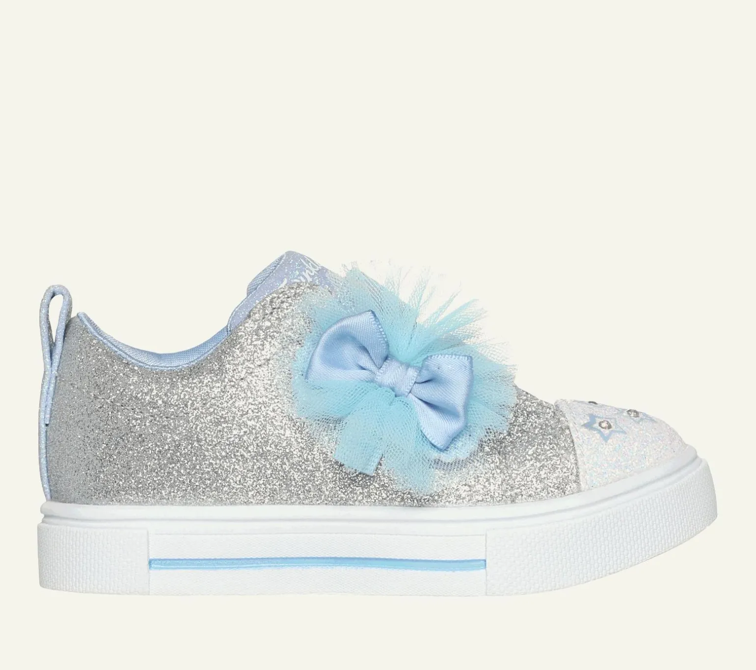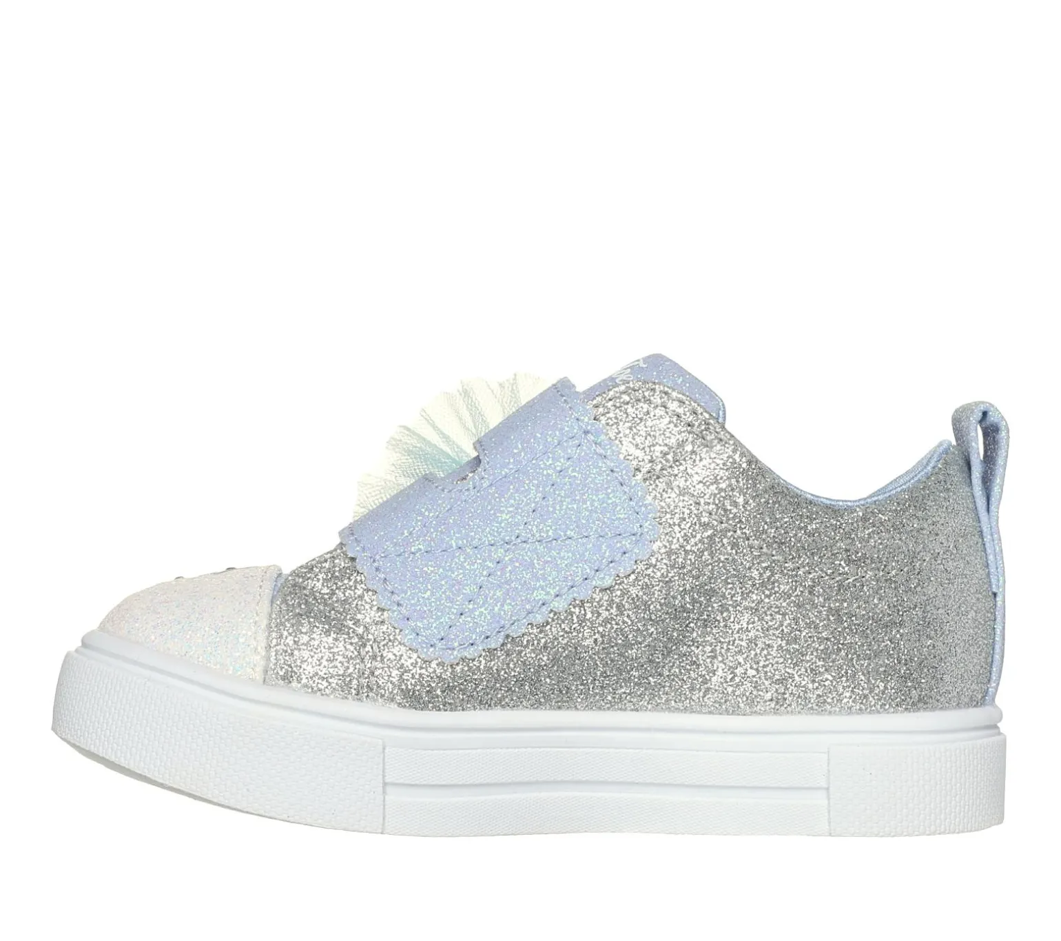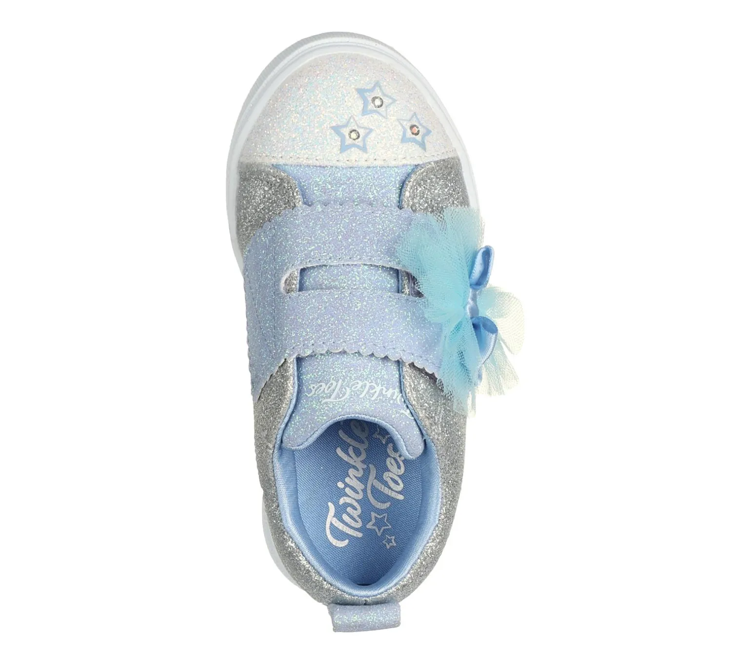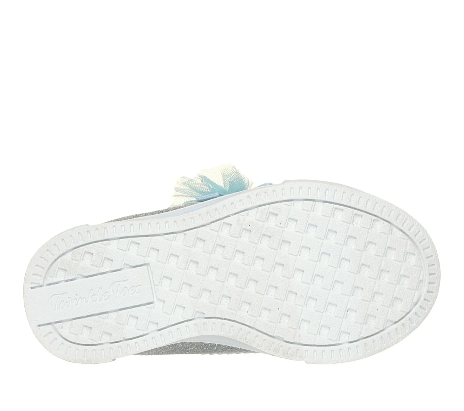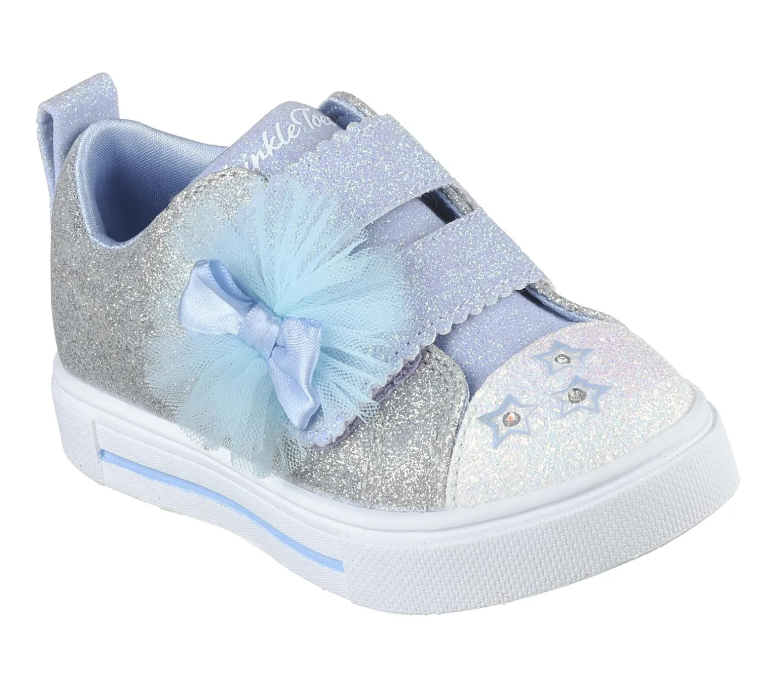 Sparkle and shine your steps in superstar style with Skechers Twinkle Toes®: Twinkle Sparks – Glitter Gems. This light-up design features a glittery synthetic upper with an adjustable instep strap, tule and bow accent, and a rhinestone embellished toe cap.