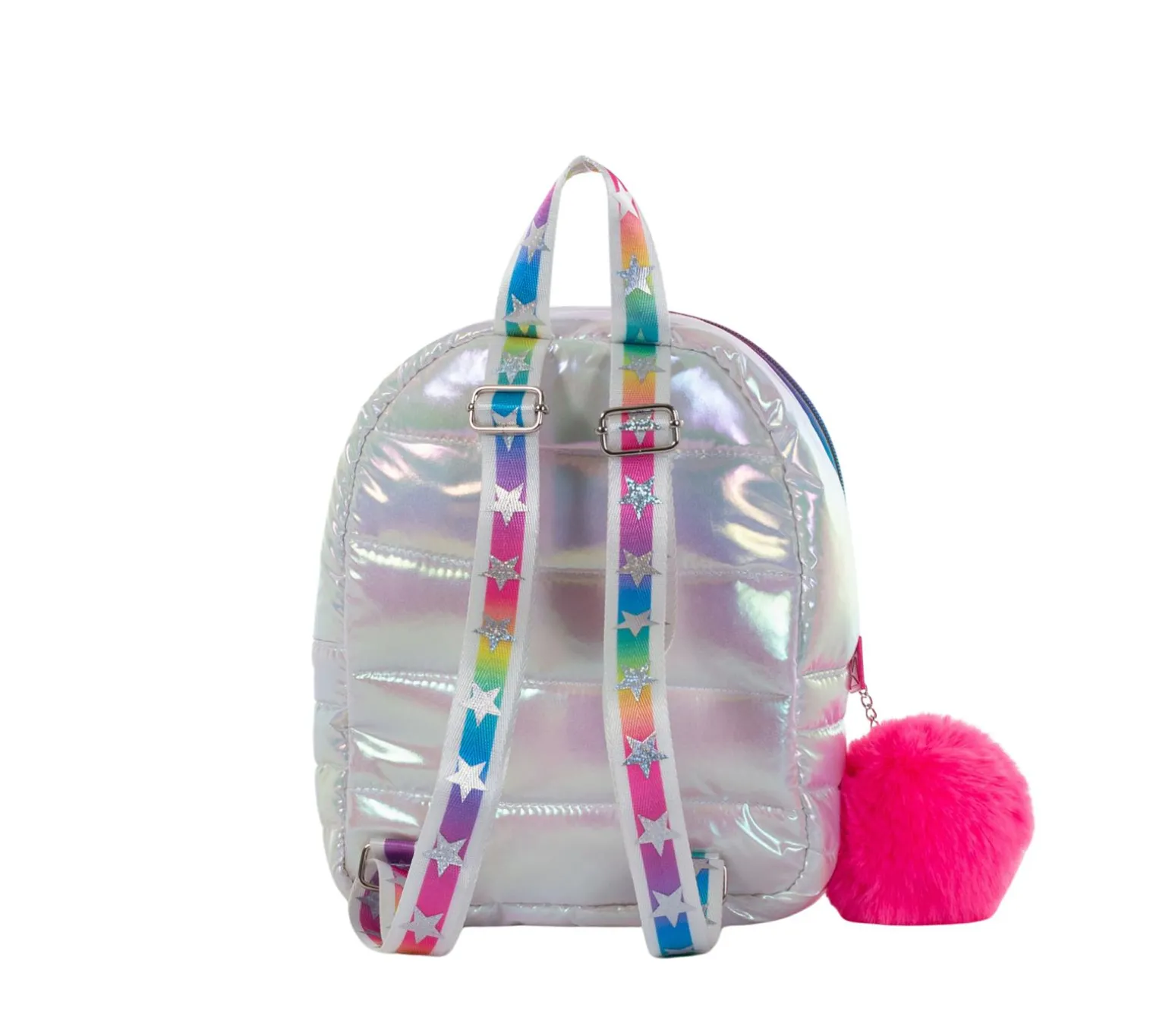 Pack your essentials with superstar style in Skechers Twinkle Toes: Puffy Mini Backpack. Featuring an iridescent star quilted fabric in a fun size mini backpack with stitching accents and a top zip closure with a fuzzy pom keychain.