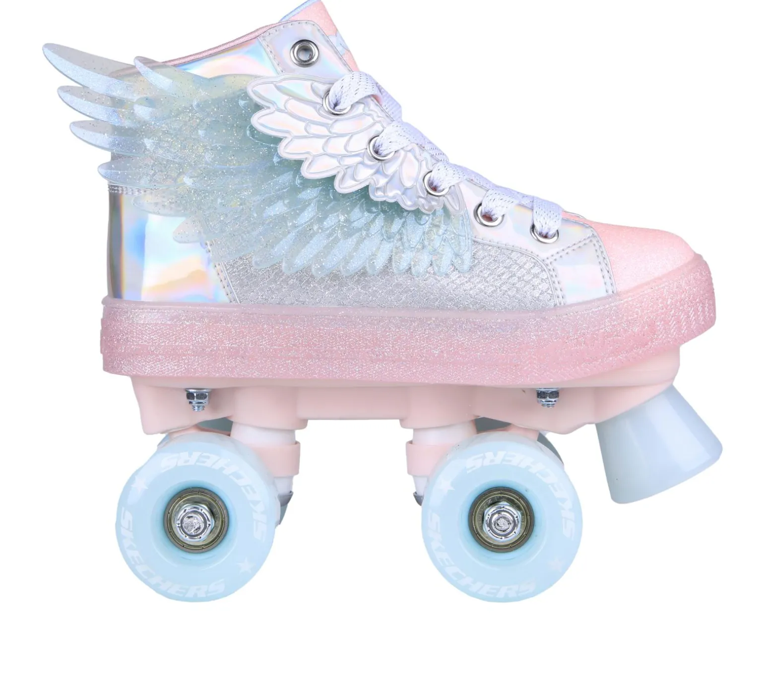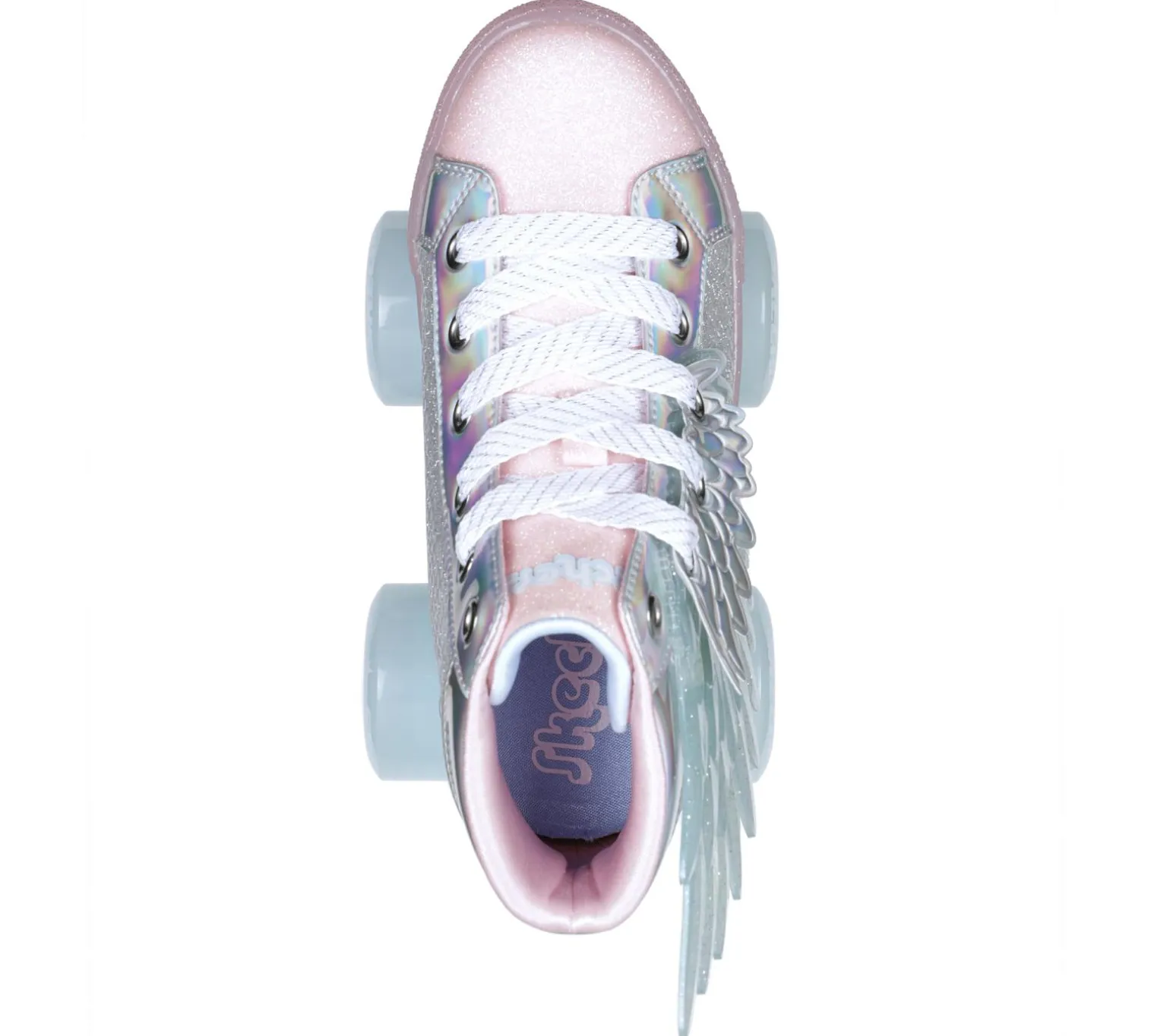 Bring some mystical magic to your roller-skates play wearing Skechers Twinkle Toes® Shuffle 4 Wheeler – Unicorn Soaring. This unicorn themed roller-skates lace-up sneaker features a glittery synthetic upper with iridescent trim, unicorn wings along the sides, complete with urethane skate wheels and front toe stopper.