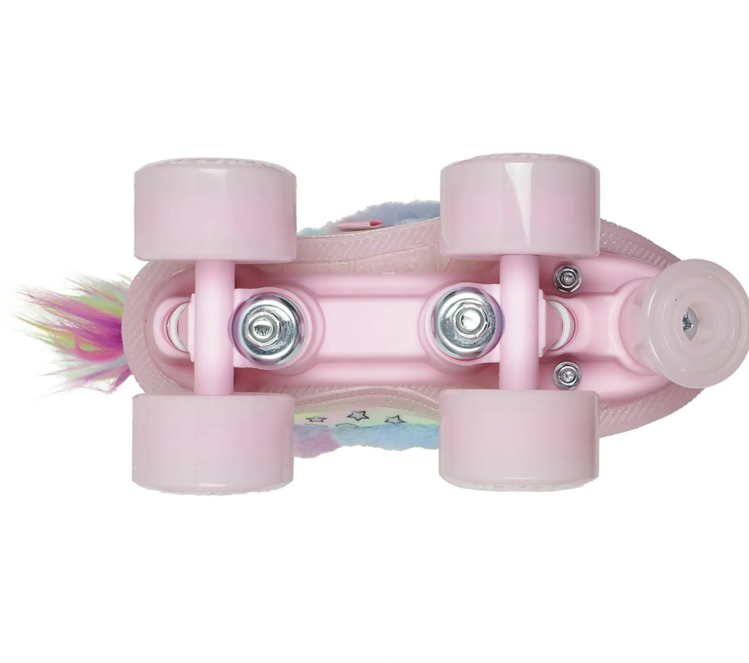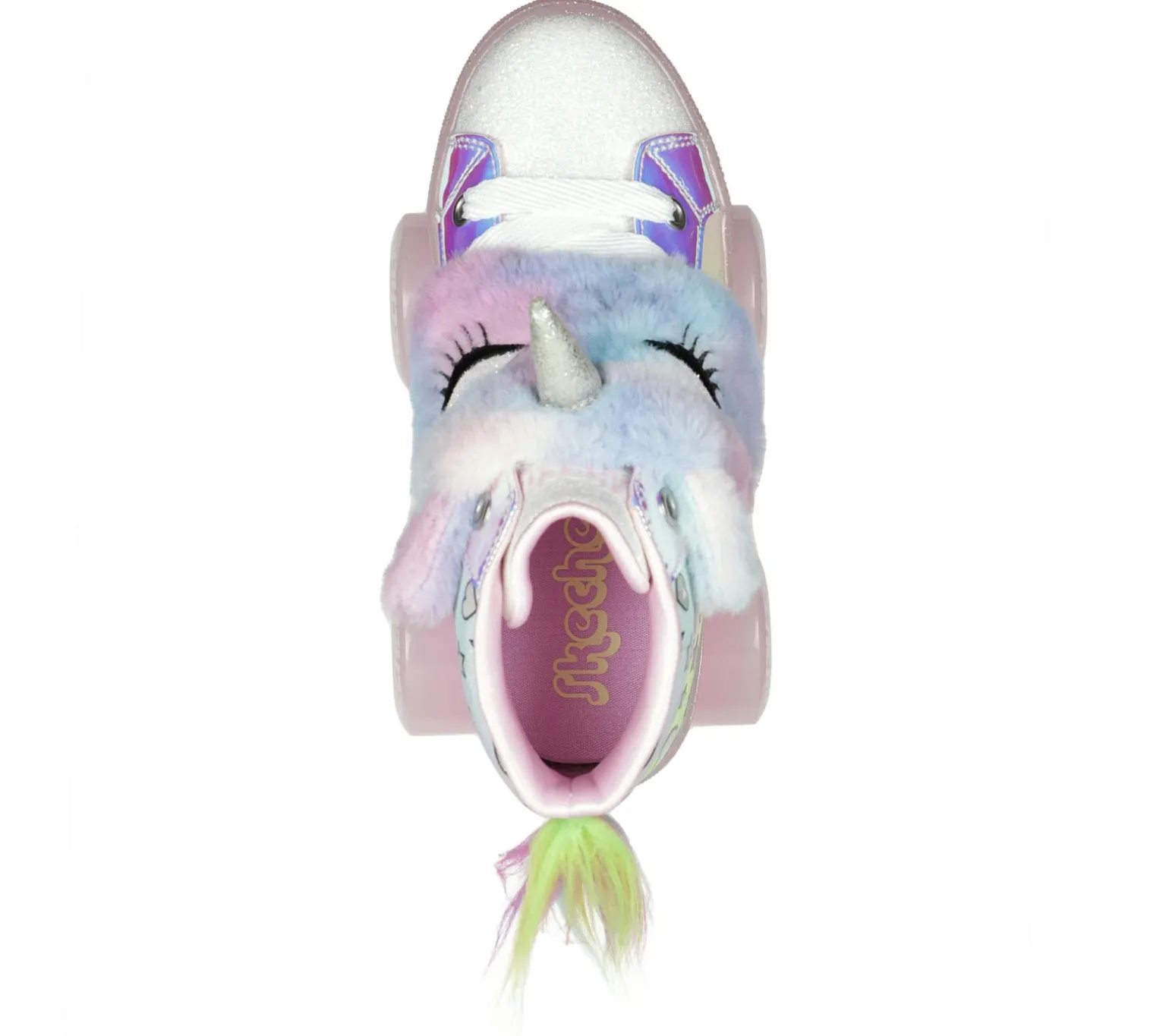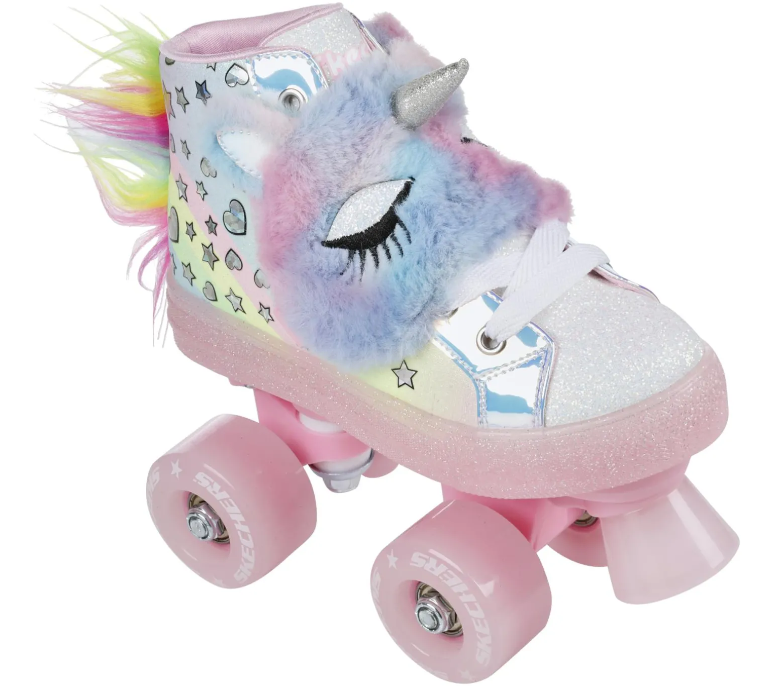 Bring some mystical magic to your roller-skates play wearing Skechers Twinkle Toes® Shuffle 4 Wheeler – Unicorn Wheelz. This unicorn themed roller-skates lace-up sneaker features a glittery and metallic heart printed synthetic upper with iridescent trim, unicorn hair on the heel panel, unicorn horn and fluff on the front panel, complete with urethane skate wheels and front toe stopper.