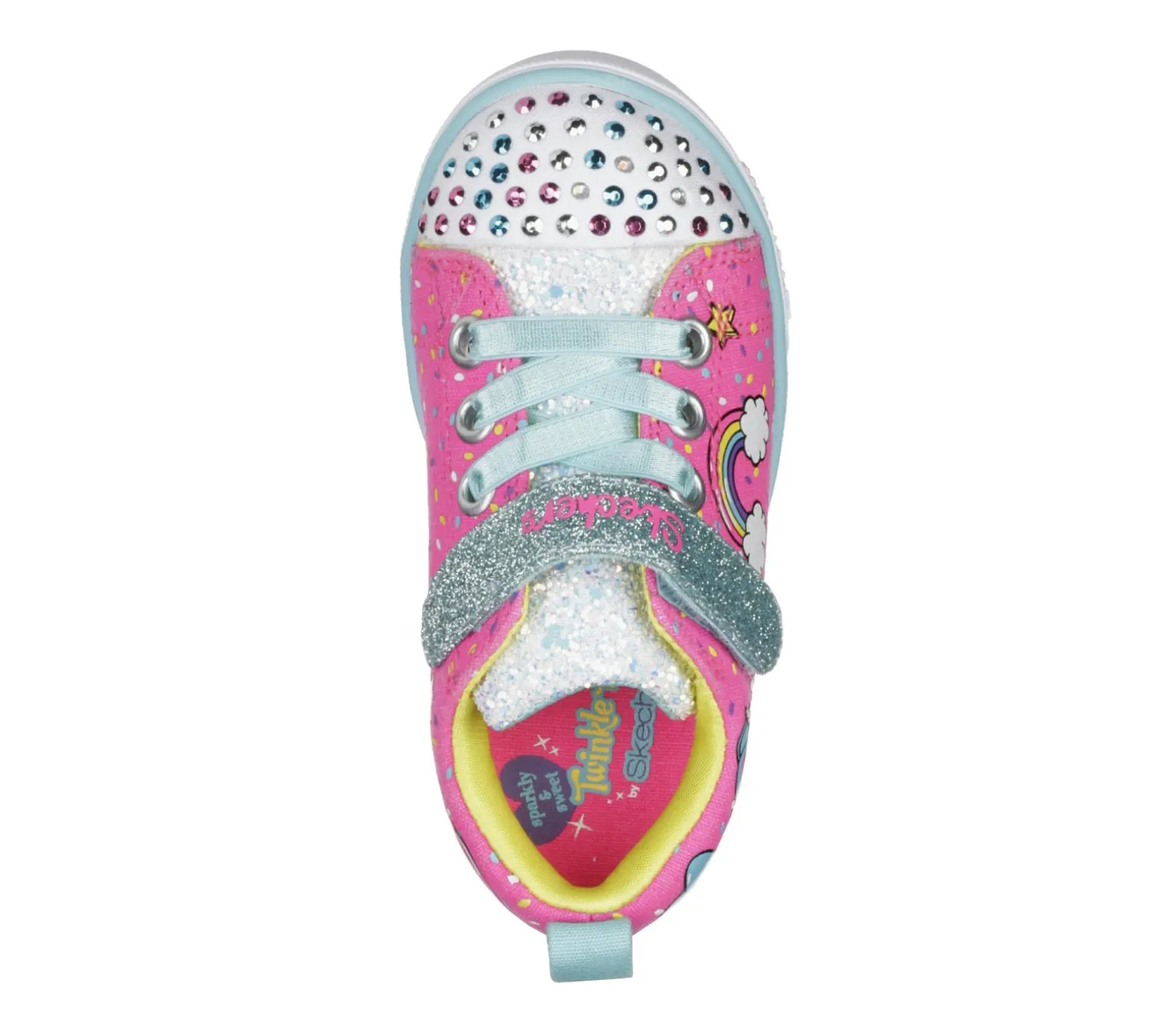 Shine in magical fun style and comfort with Skechers Twinkle Toes®: Sparkle Lite – Unicorn Craze. This slip-on features a soft canvas and glitter finish fabric upper in a light-up design with rainbow, unicorn and star graphics.