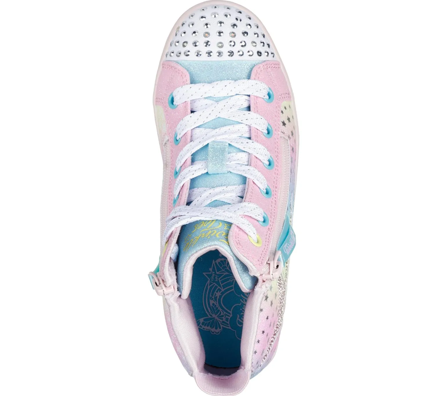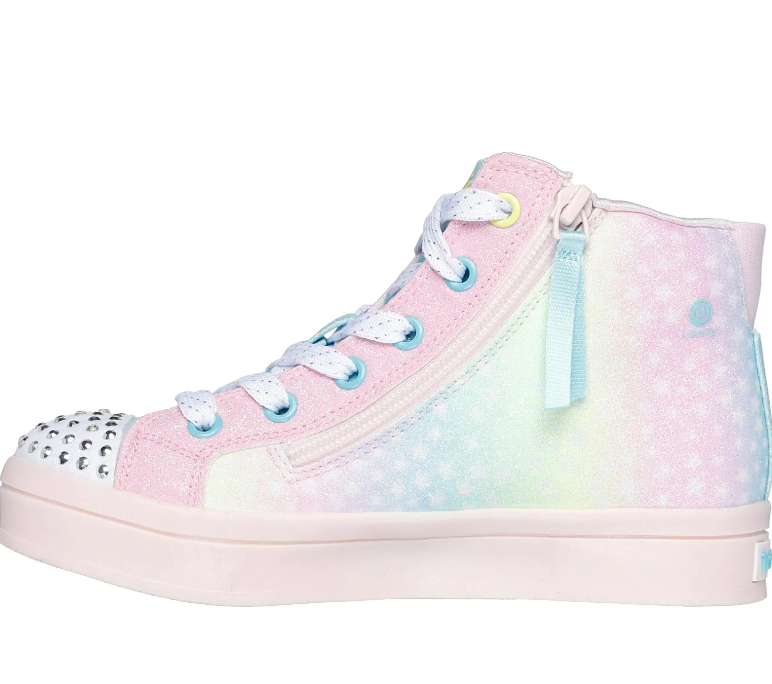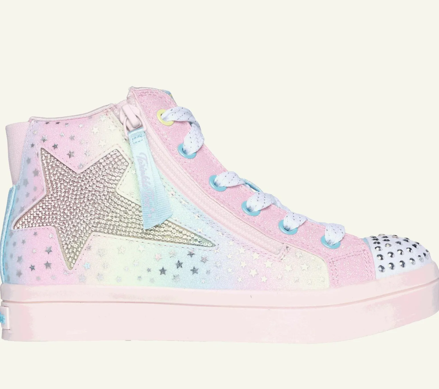 Sparkle and shine in star-studded style wearing Skechers Twinkle Toes®: Twi-Lites 2.0 – Star Zips. This high-top lace-up features a synthetic glitter finish upper with metallic star print and rhinestud star quarter detail, light-up embellished toe, dual side zippers, and a cushioned comfort insole.