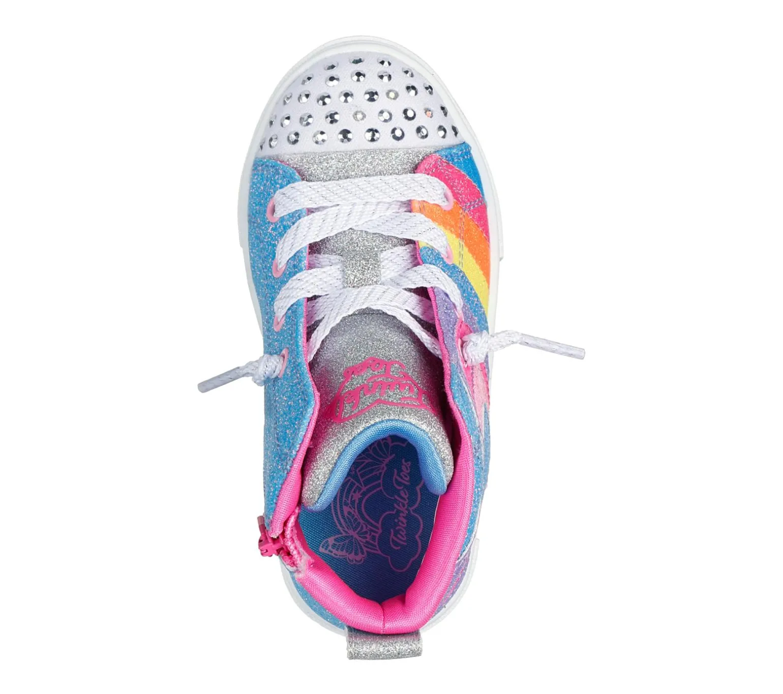Hearts sparkle with Skechers Twinkle Toes®: Twinkle Sparks – Heart Pop. This high-top lace-up sneaker features a glittery upper with a layered heart design, medial zipper, and a light-up rhinestone embellished toe.