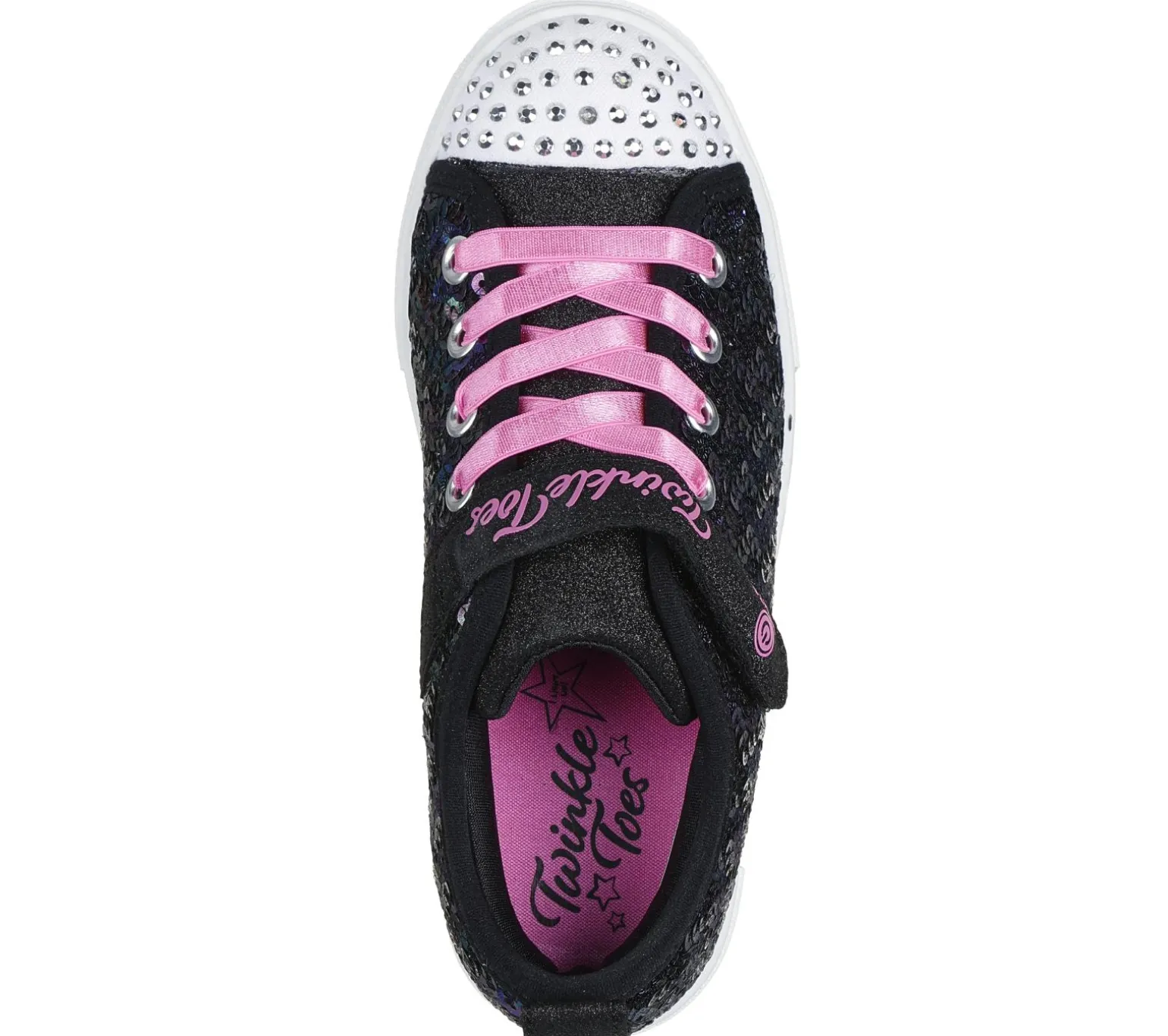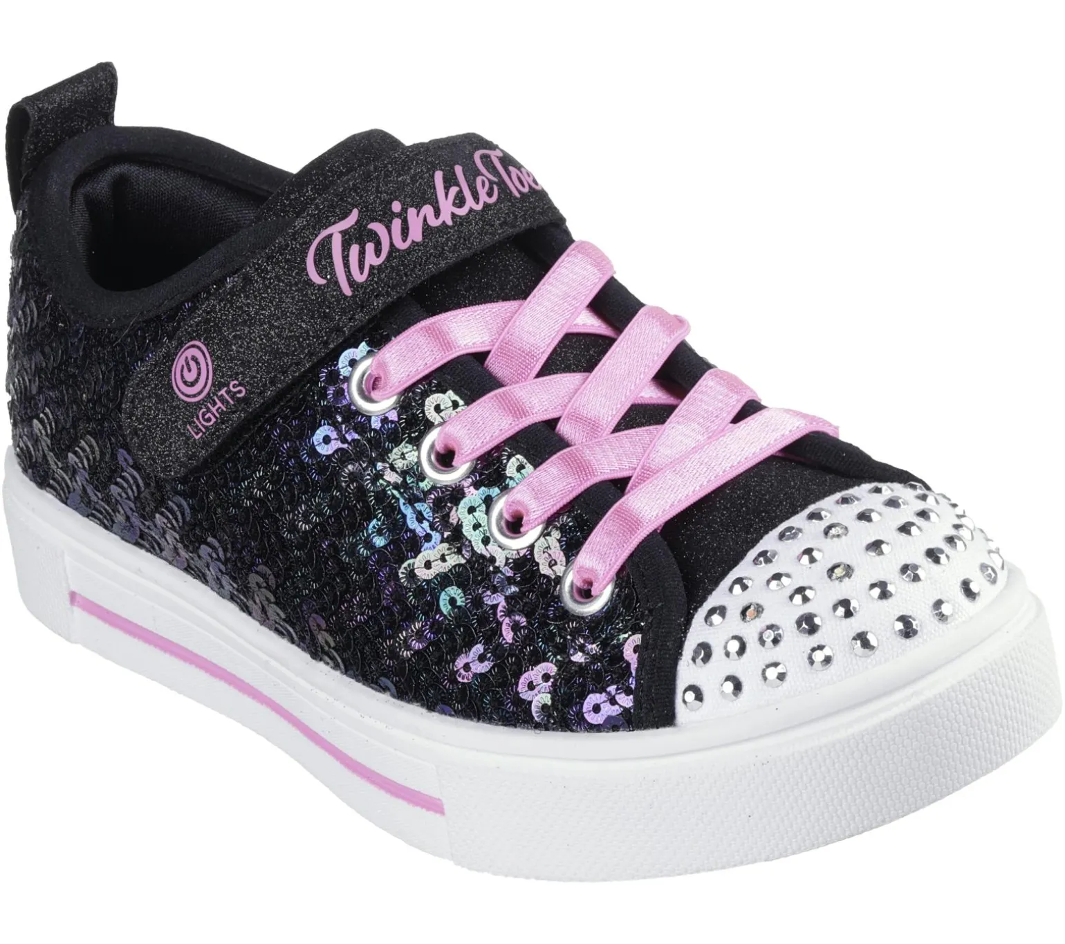 Light up your steps with shimmering style in Skechers Twinkle Toes®: Twinkle Sparks – Sequin Party. This fun light-up sneaker features a sequin embellished upper with glitter trim, stretch laces, Skechers Adaptive Closure, and a rhinestud embellished toe.