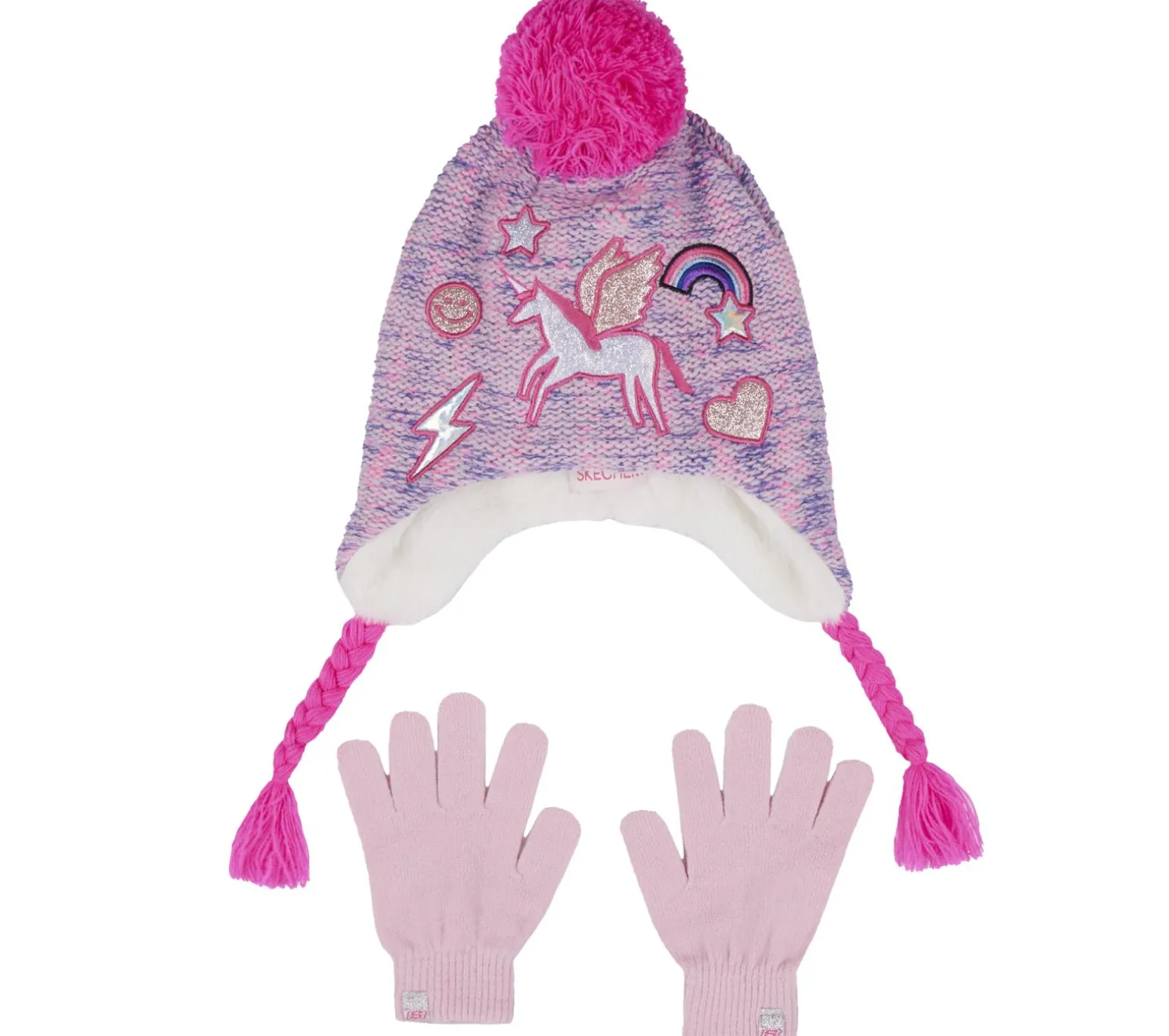 Enjoy magical fuzzy warmth wearing Skechers Unicorn Embroidery Hat and Glove Set. This knit alpine style hat features plush poly lining, braided tassel pulls, unicorn-themed patchwork, and a pair of coordinating solid color gloves.