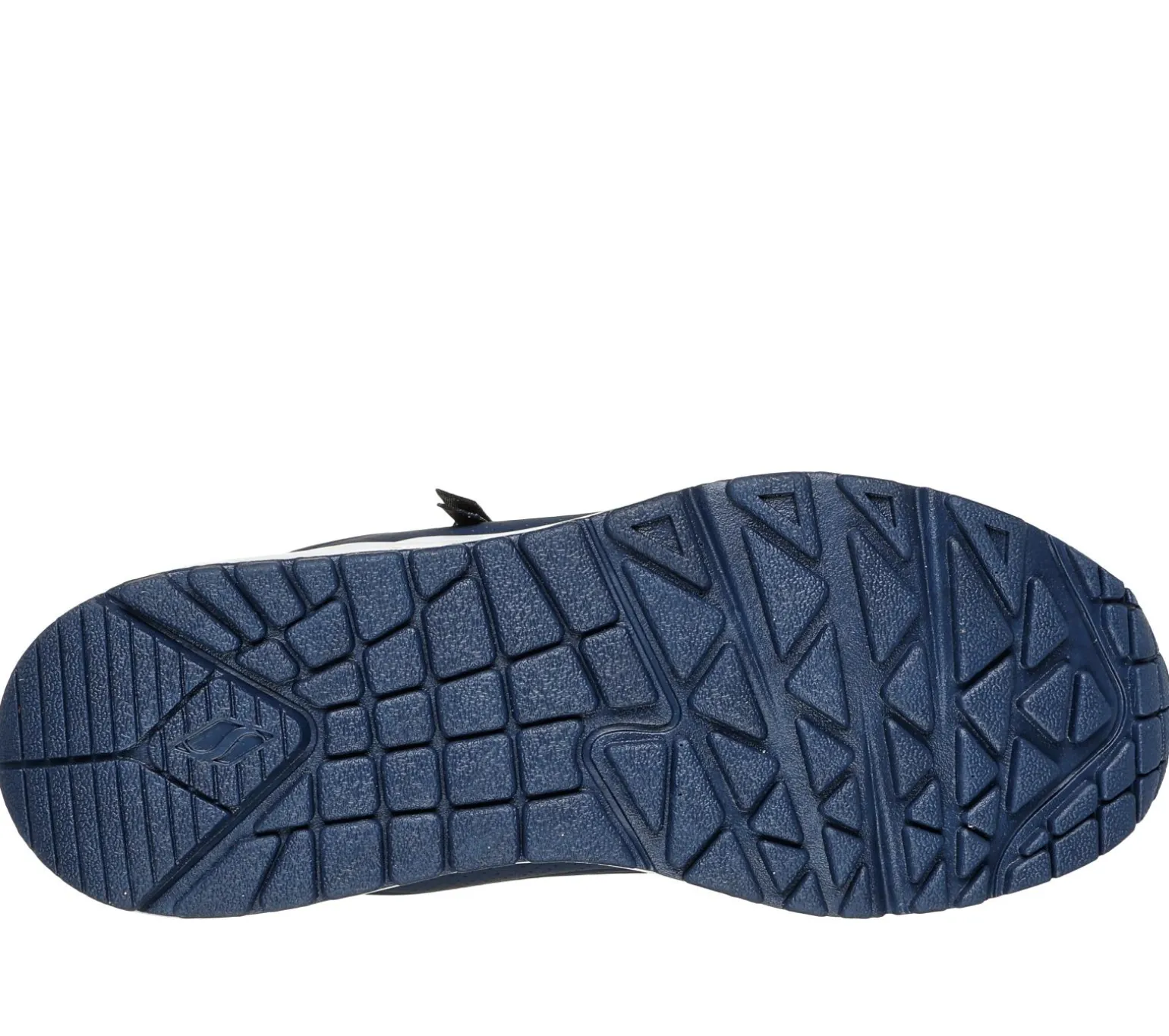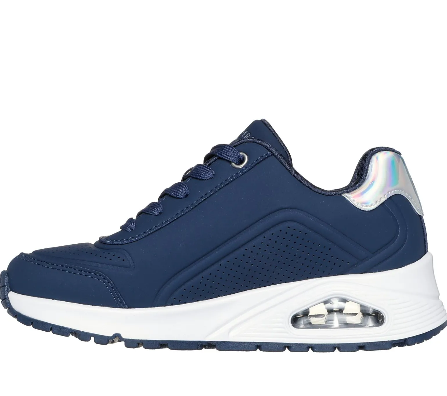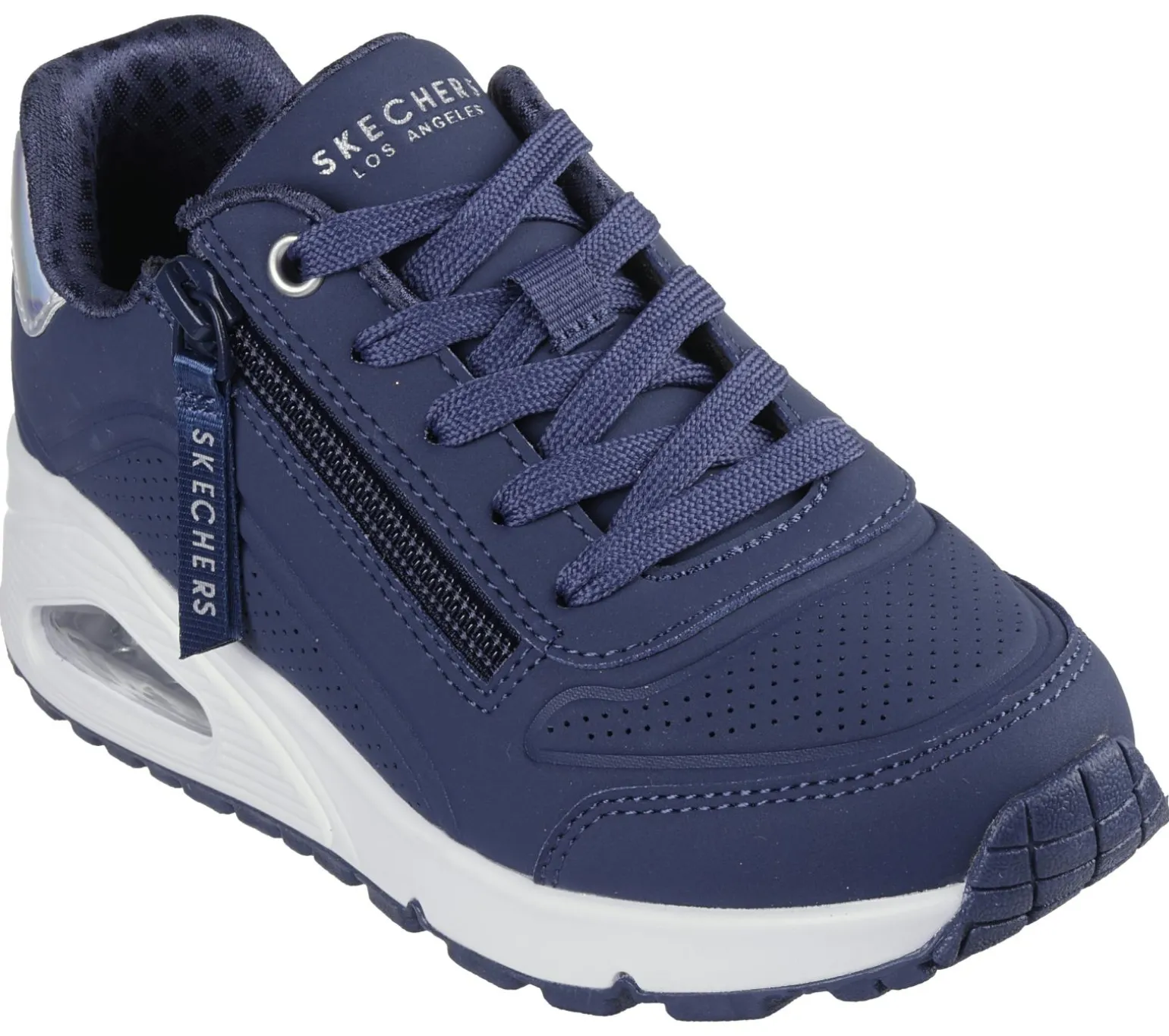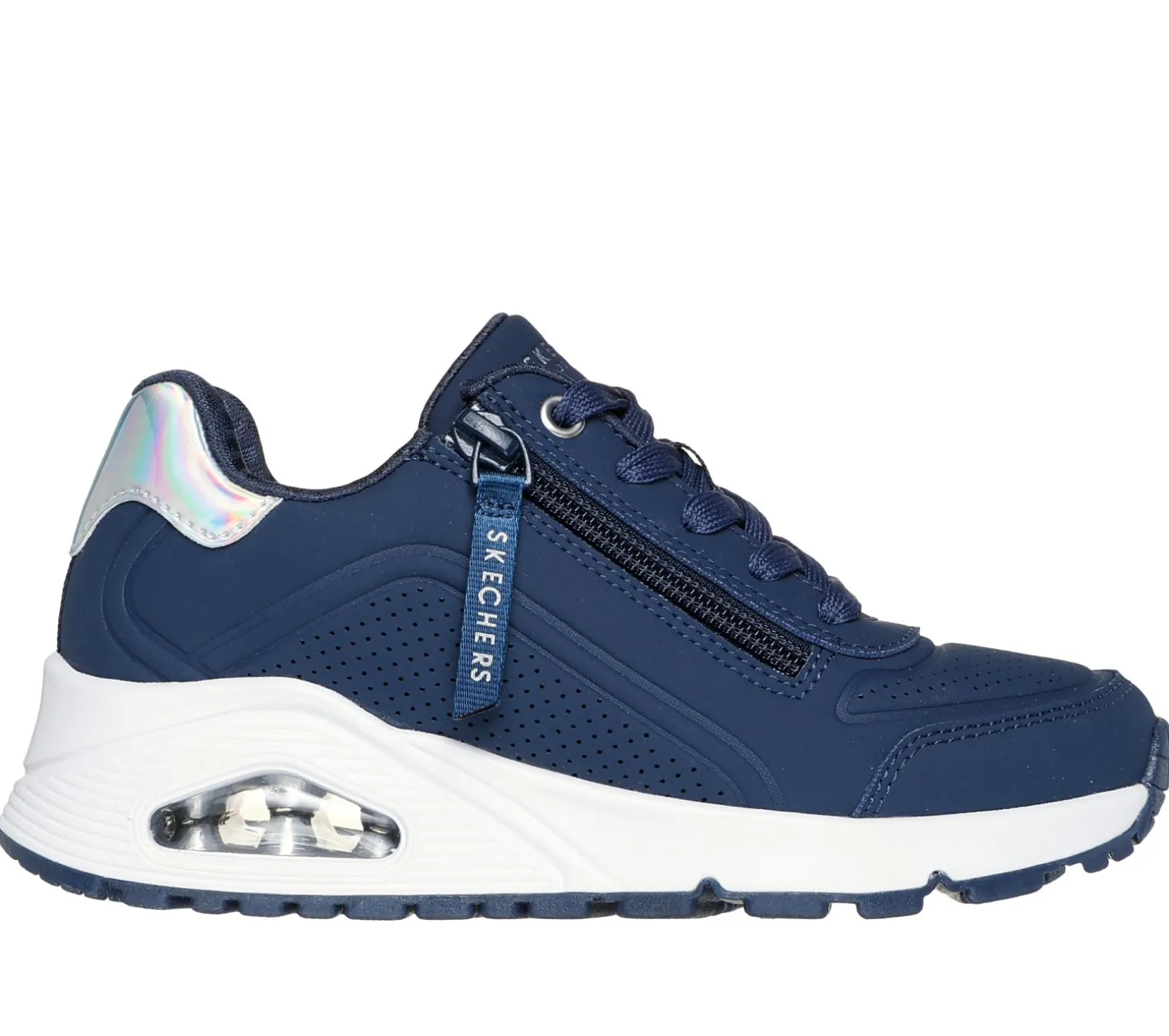 Level up your sneaker game with cushioned comfort wearing Skechers Street Uno Gen1. This lace-up fashion sneaker features an synthetic duraleather upper with holographic trim, lateral zipper, a Skechers Air-Cooled Memory Foam® comfort insole, and a visible Skech-Air® airbag midsole.
