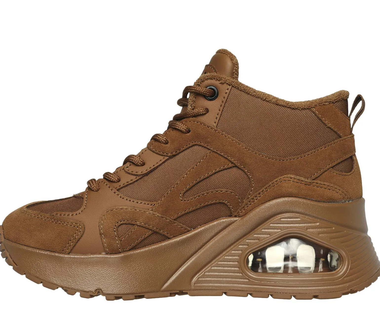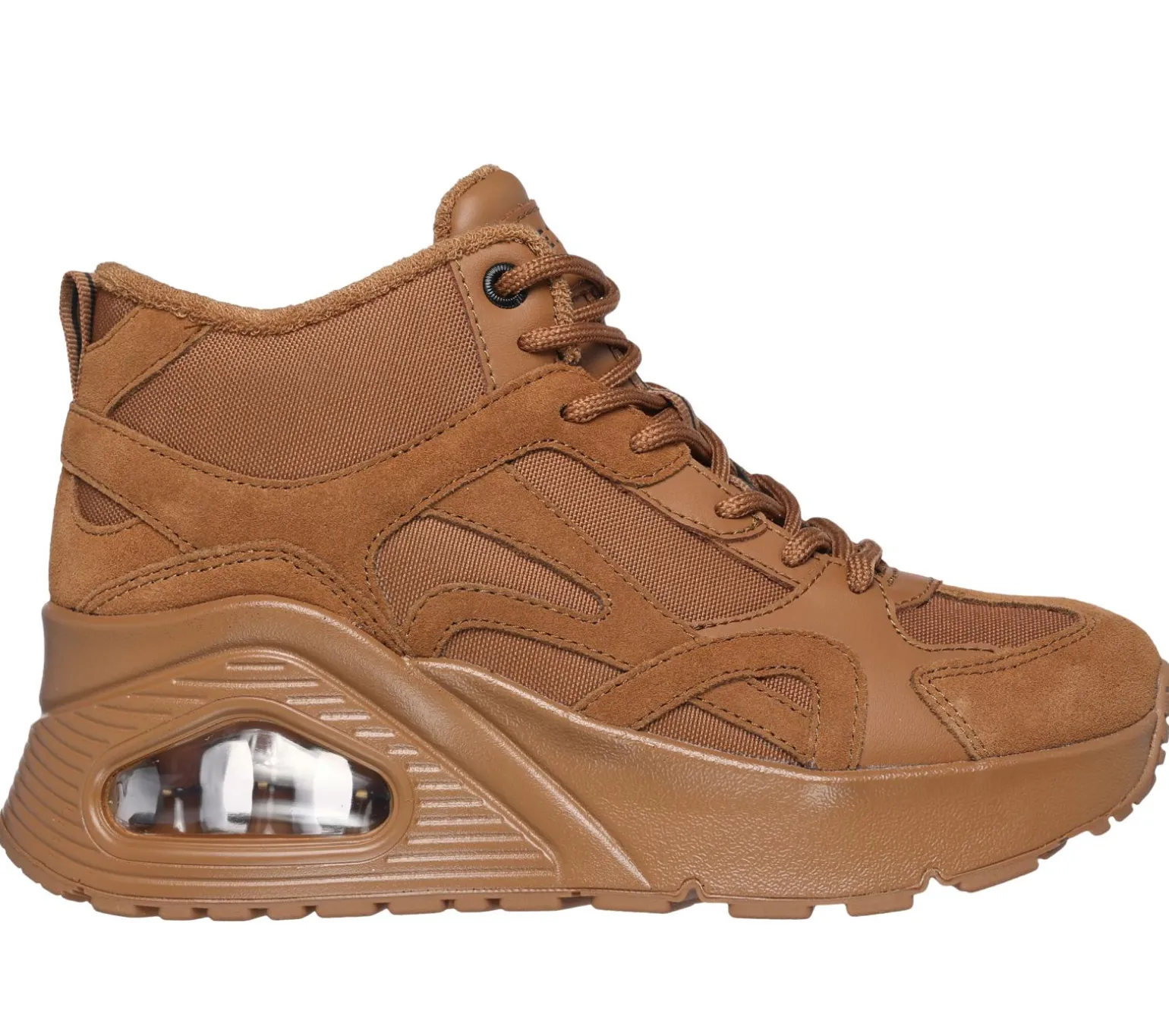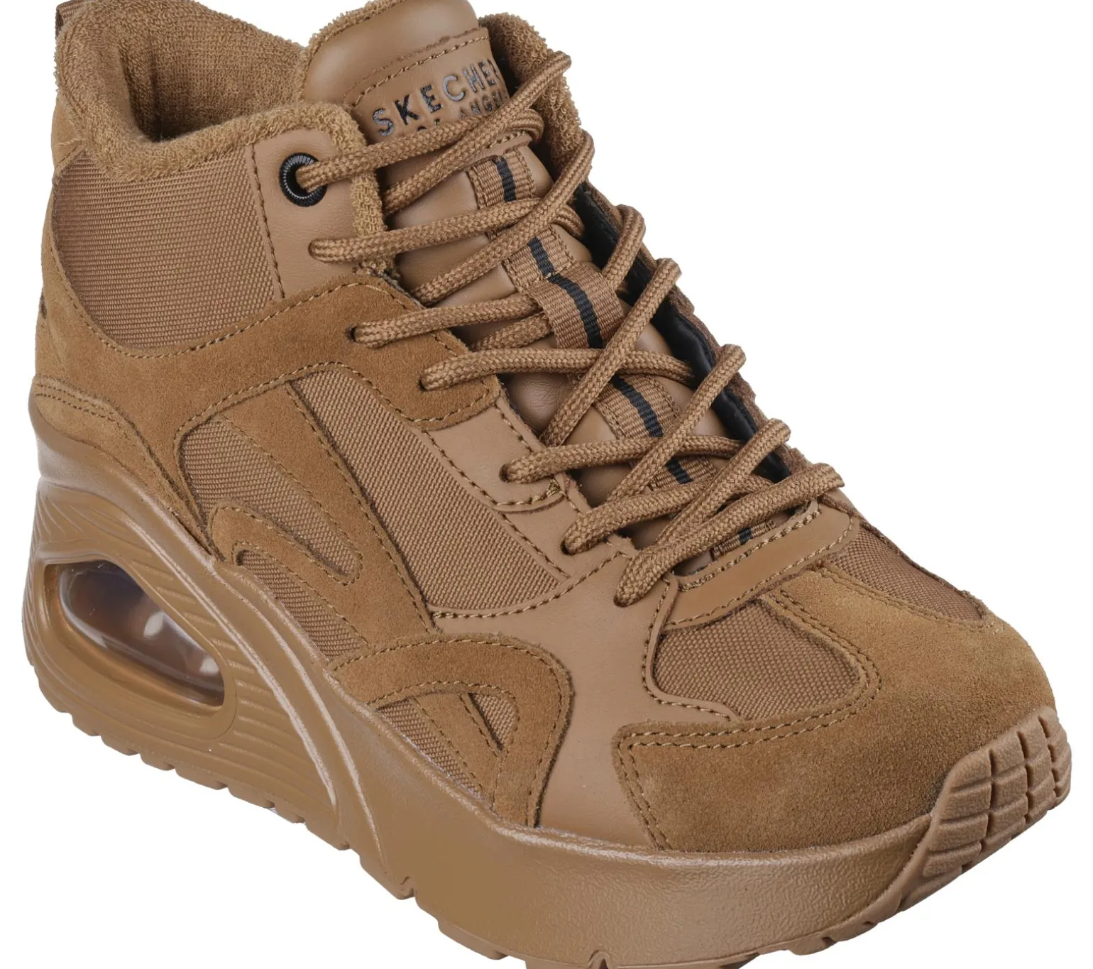 Boost your style with an on-trend statement in Skechers Street Uno Hi – Rocliff Road. This high-top platform fashion sneaker features a mesh upper with suede and duraleather overlays, Skechers Air-Cooled Memory Foam® insole, and a wedged, Skech-Air® visible airbag midsole.