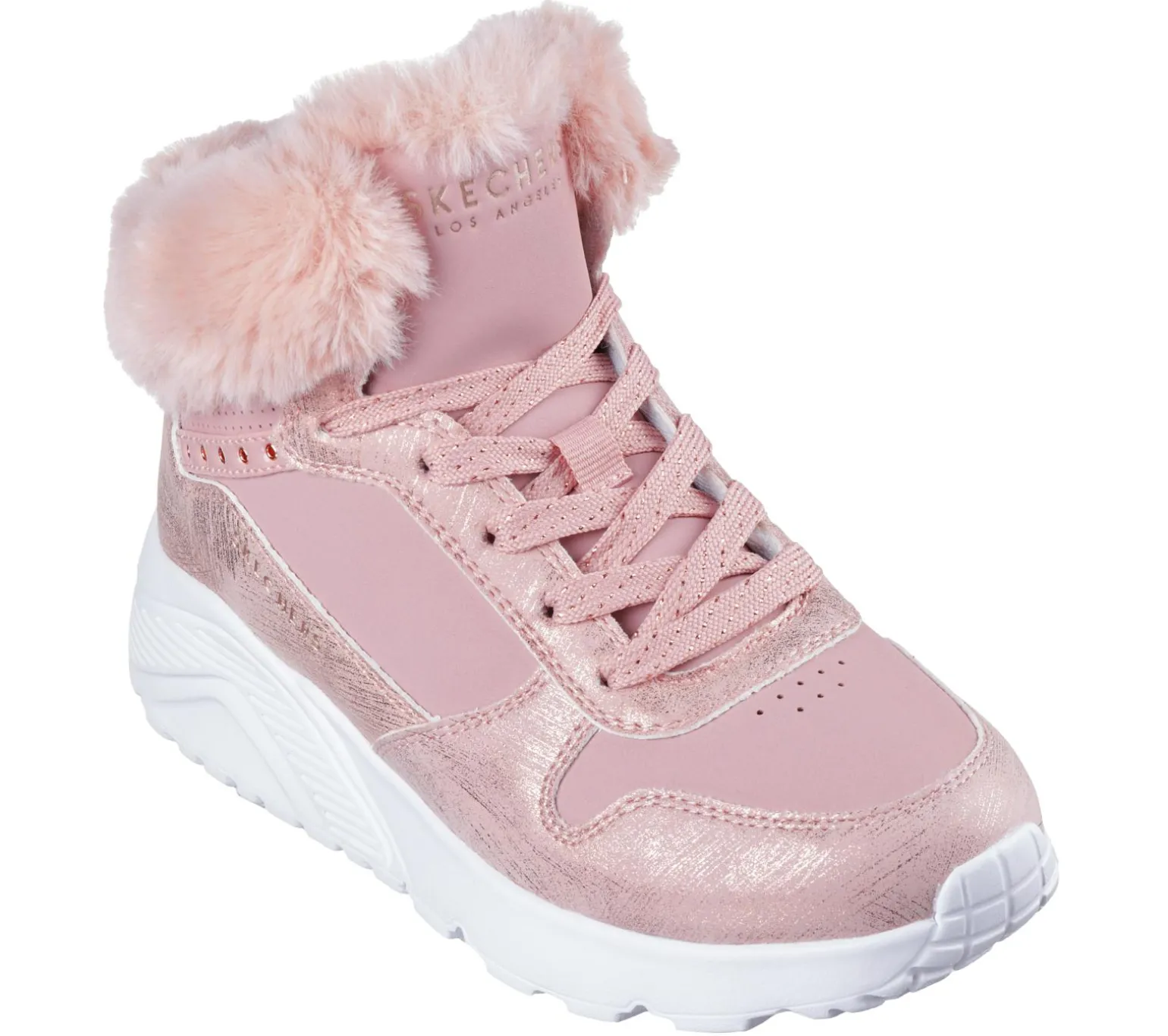 Sporty ‘diva’ style meets cozy comfort in Skechers Street Uno Lite – Comfurt Collar. This mid-top fashion sneaker features a durabuck upper with distressed metallic overylays, faux-fur collar trim, side-zipper with Adaptive Closure, and a Skechers Air-Cooled Memory Foam® insole – all on a platform wedge midsole.