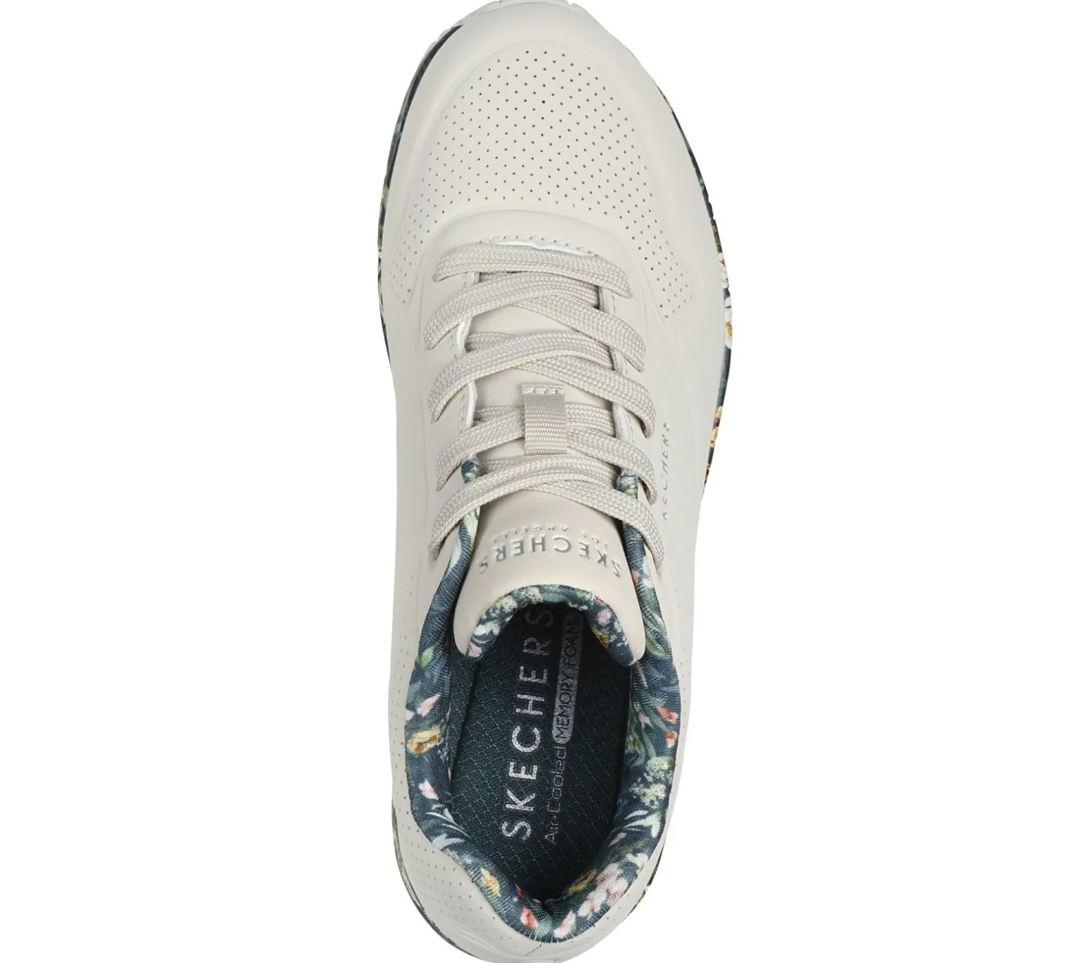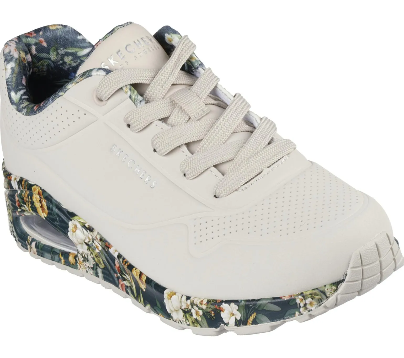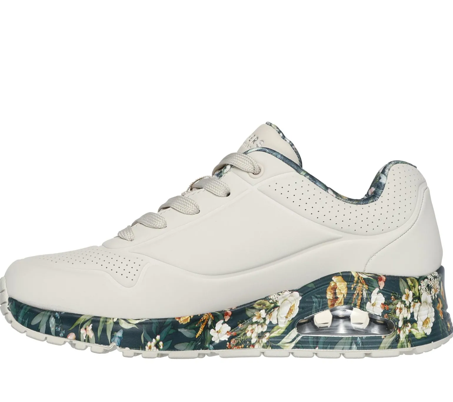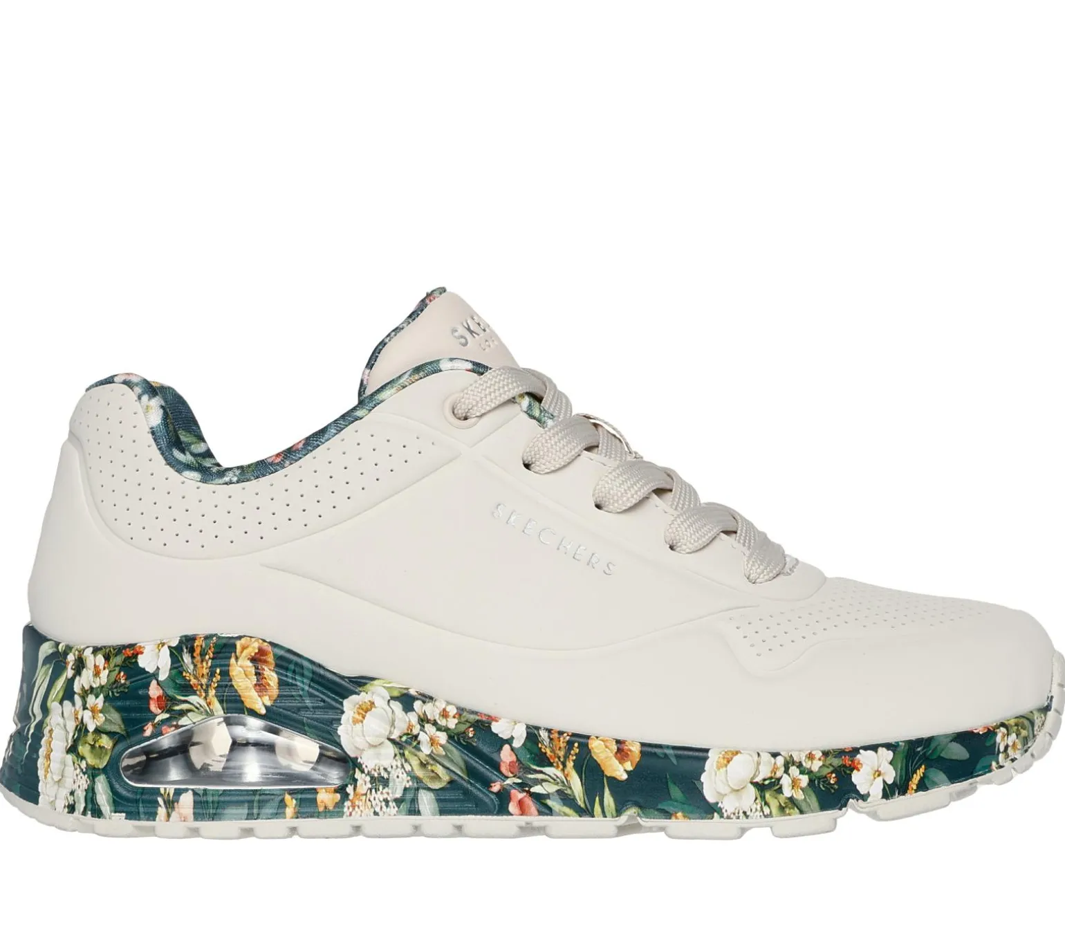 Embrace the beauty of nature with Skechers Street Uno – Majestic Garden. This lace-up fashion sneaker features a synthetic durabuck upper with a floral print trim, Skechers Air-Cooled Memory Foam® insole, and a visible Skech-Air® midsole.