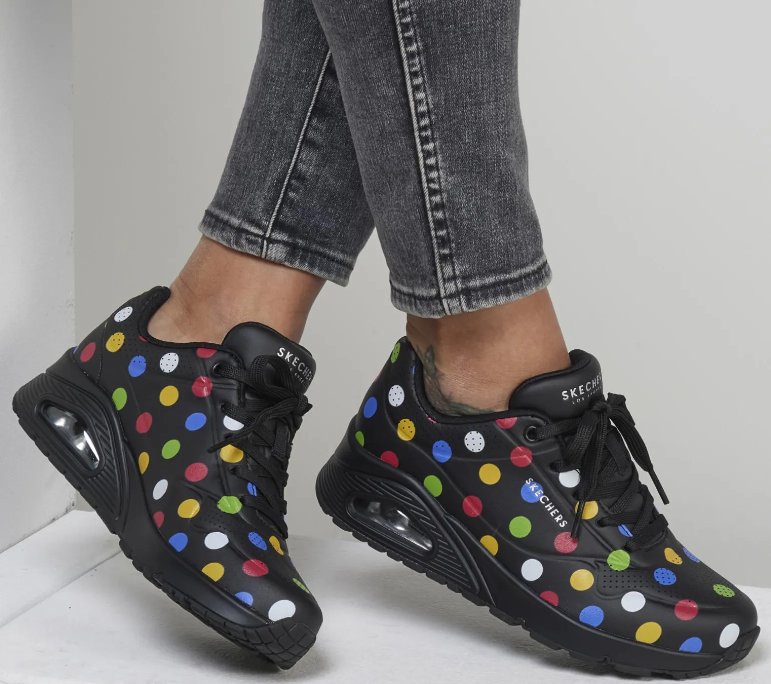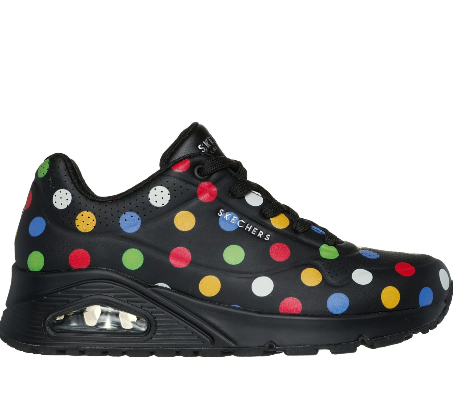 Show your creative style with added comfort in Skechers Street Uno – Spotted Air. This lace-up fashion sneaker features a polka dot printed durabuck upper with a Skechers Air-Cooled Memory Foam® insole and a visible Skech-Air® midsole.