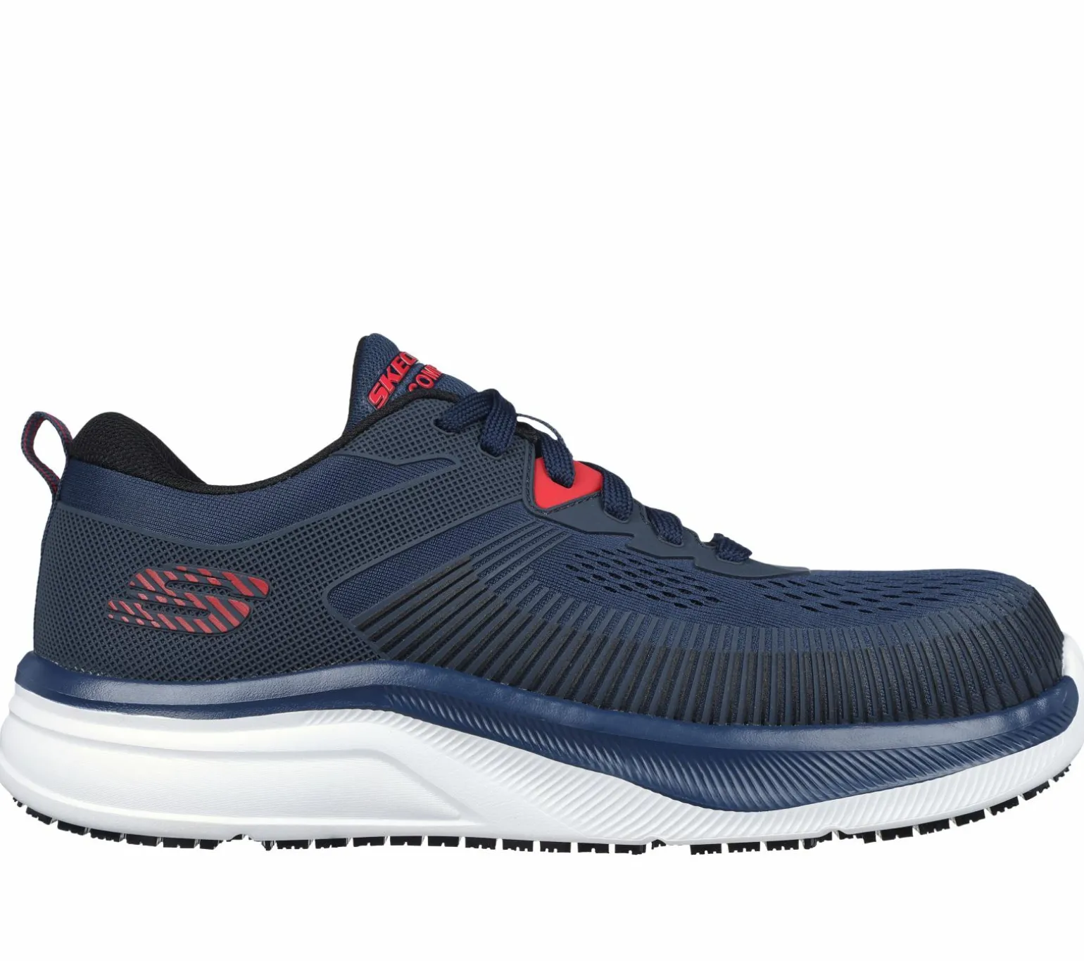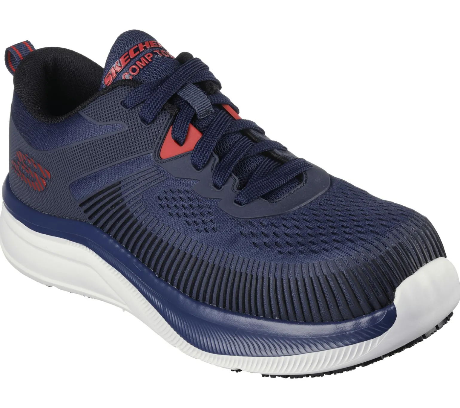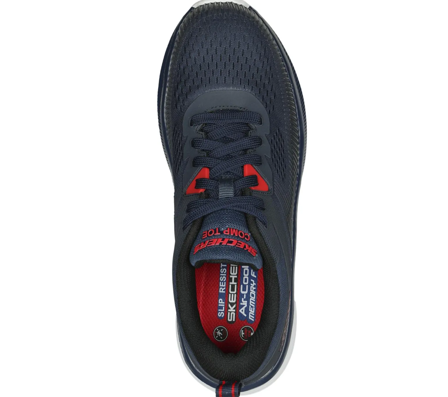 Get that athletic look while staying safe and comfortable in Skechers Work: Jevion. This sporty lace-up features a mesh and raised synthetic detail upper with a composite safety toe and a Skechers Air-Cooled Memory Foam cushioned comfort insole.